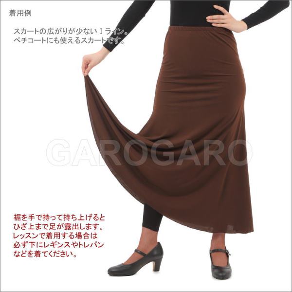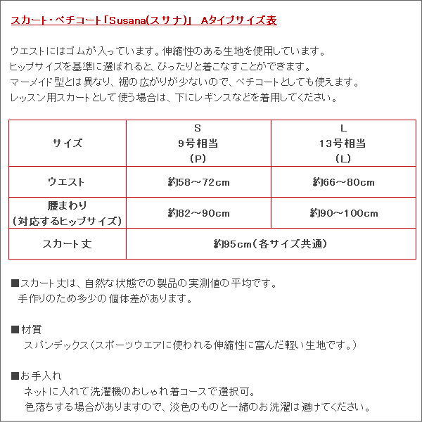 おすすめポイント: セビージャ発。広がりが少ないスカートなので、ペチコートとしても利用できます。ストレッチがきいた生地なので、足の動きを妨げません。 レッスン用のスカートとして使うこともできます。マーメイド型やフレアスカートと比べると裾の広がりが少ないので、両手で裾を持つと、足がひざ上まで露出します。トレパンやレギンスなどを合わせて着用してください。 生地の伸縮性を生かし、腰で留めてはくスカートです。日本人向けにやや細身に仕立てました。 --- 素材: ポリエステル・ポリウレタンなど サイズ(cm): S・L 詳しいサイズについてはサイズ表をご覧ください。 (掲載のサイズは製品の実測値です。多少の個体差がありますがご容赦ください。) |