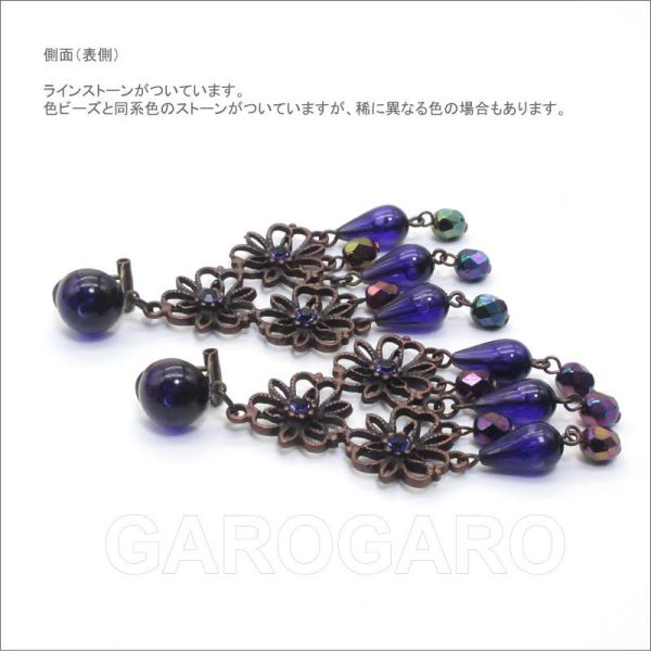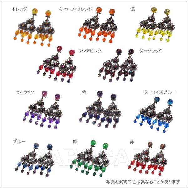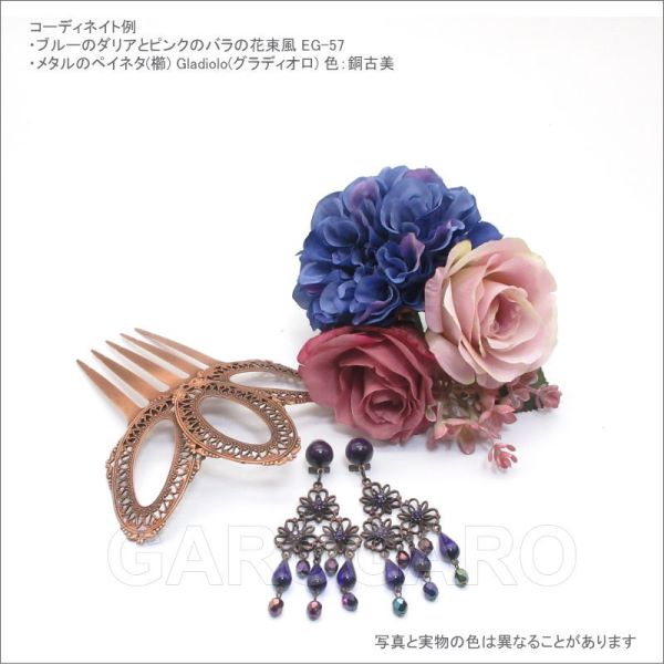 おすすめポイント: 人気のメタル素材とクリアビーズのイヤリング(ピアス)です。程よい大きさで比較的軽量です。 各色、在庫数は1~5組程度とわずかしかありませんが、似た色や形で揃えることもできるので、群舞にもおすすめ。 同じモデル、色でも、使用しているビーズの形や色合いに若干の個体差がありますが、大きく目立たない限りは同一商品として販売しています。ご容赦ください。 --- 【ピアス針つき】ピアス針とクリップが両方ついたスペインの留め具を使用しています。 【在庫限り】 --- 素材: プラスチック・金属 サイズ(縦の長さ×横幅)cm: 約8.1(飾り部分の長さ:6.3)×3.5 (掲載のサイズは製品の実測値です。多少の個体差がありますがご容赦ください。) 【コーディネイト例】 ・ブルーのダリアとピンクのバラの花束風 EG-57 ・メタルのペイネタ(櫛) Gladiolo(グラディオロ) 色:銅古美 |