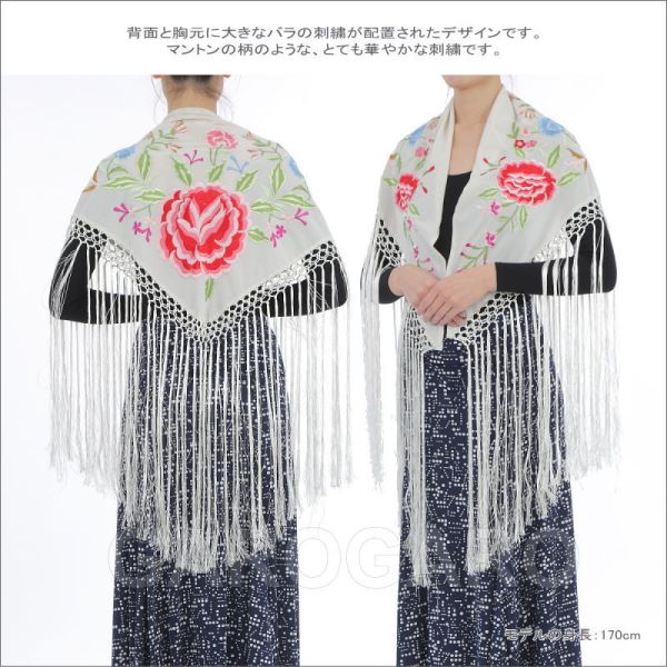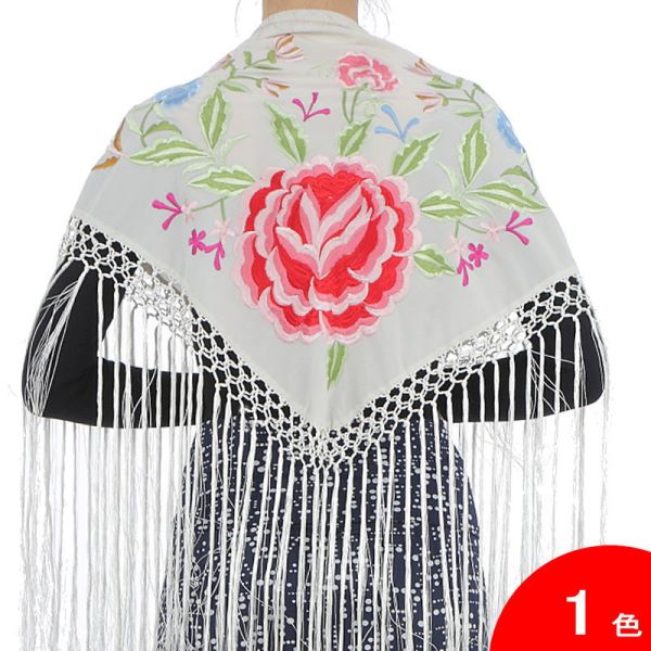 おすすめポイント: 刺繍を施した 豪華なマントンシージョ(三角形のショール)です。伝統的な大きなバラの刺繍がとても豪華です。 機械刺繍です。 --- 素材: 主にレーヨン、ポリエステルなどの混紡 サイズ(cm): 【長さ(首側の一番長い辺)】 約140cm 【縦の長さ (長辺から頂点まで)】60cm 【フレコ(フリンジ) (網の部分を含む)】 約50cm (掲載のサイズは製品の実測値です。多少の個体差がありますがご容赦ください。) |