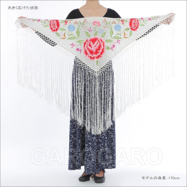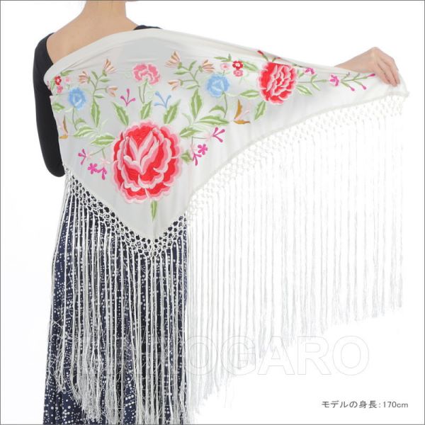 補足説明 お手入れ: ドライクリーニング(信頼のあるお店にご依頼ください) ・水洗いは避けてください。 ・フレコ(フリンジ)が縮れたときには、スチームアイロン(中温)で伸ばすことができます。 ----- ・刺繍の柄、色の組み合わせが画像と多少異なる場合がありますがご容赦ください。 ・生地部分が濃色のショールは、フレコと生地がこすれる部分が白っぽく見える跡がついてしまいますが、これは素材の特性で避けられません。 ・稀に水濡れなどで色移りする場合があります。 ・ご覧になるモニターによって、実物と写真の色合いが異なって見える場合があります。 ・刺繍や縫い目の糸の端が出ていることがありますが、ほつれてしまいますので、切ったり引っ張ったりしないでください。 ・スペイン製です。縫製が多少雑なことがあります。糸つれ、色むらなどがあったり、縫製用の印、針穴などが残っている場合があります。大きく目立つ場合は検品時に取り除きますが、舞台でご使用するのに問題ないと判断できる程度である場合は良品と判断致します。あらかじめご了承下さい。 |