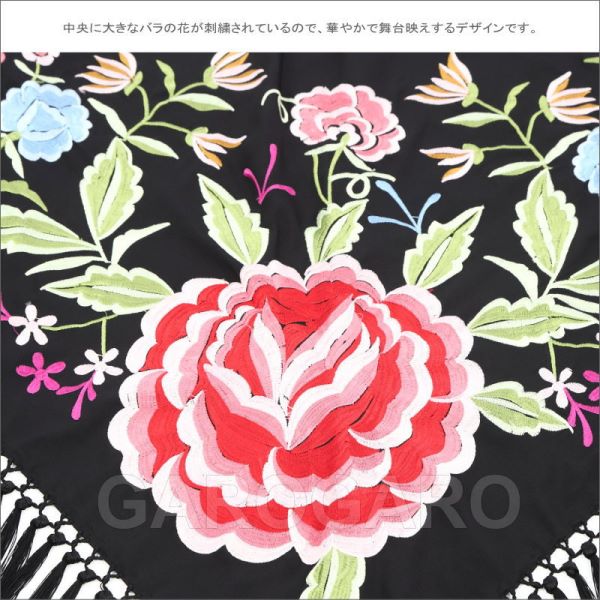 マドローニョのついた刺繍のショール Jardin(ハルディン) 黒×中央の花:赤紫系[フラメンコ用][スペイン直輸入]