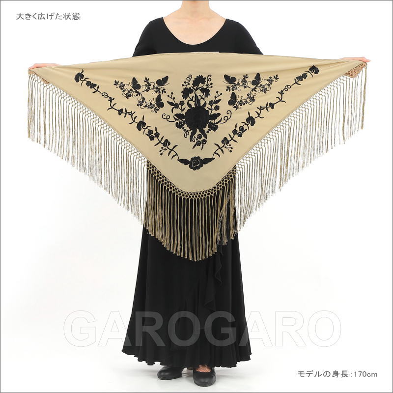 おすすめポイント: 刺繍を施した 豪華なマントンシージョ(三角形のショール)です。濃いめのベージュ色に黒色の単色刺繍。黒い衣装に合わせて頂くと、美しさが際立ちます。 機械刺繍です。 --- 素材: 主にレーヨン、ポリエステルなどの混紡 サイズ(cm): 【長さ(首側の一番長い辺)】 130cm 【縦の長さ (長辺から頂点まで)】58cm 【フレコ(フリンジ) (網の部分を含む)】 約25cm (掲載のサイズは製品の実測値です。多少の個体差がありますがご容赦ください。) |