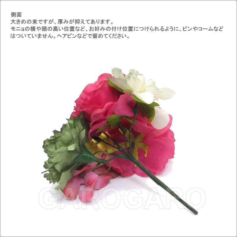 補足説明 ・モニョ(おだんごに結った髪型)の横や頭の高い位置など、お好みの付け位置につけられるように、ピンやコームなどはついていません。ヘアピンなどで留めてください。 ・ご覧になるモニターによって、実物と写真の色合いが異なって見える場合があります。 ・衛生上の理由から、商品が入った透明な袋を開封後は返品、交換ができません。 ・布製の造花なので、端にほつれや染ムラがあることがあります。 ・入荷時期によって、花の大きさや色合い、花束風の商品は花の配置、小花や葉の個数がわずかに異なることがあります。 大きく目立つ場合は検品時に取り除きますが、舞台でご使用するのに問題ないと判断できる程度である場合は良品と判断致します。あらかじめご了承下さい。 ・稀に水濡れなどで色落ちする場合があります。ご注意ください。 |