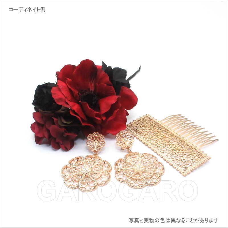 おすすめポイント: 以前はシルバーが多かったフラメンコのアクセサリですが、最近はゴールドも多く使われるようになりました。 ”イエベ”の方にとっては、肌との相性も良いのがうれしいですね。 フラメンコらしい、大振りのデザインです。 --- 【ピアス針つき】ピアス針とクリップが両方ついたスペインの留め具を使用しています。 --- 素材: 金属 サイズ(縦×横)cm: 約7.7(飾り部分の長さ:5.9)×5.2 (掲載のサイズは製品の実測値です。多少の個体差がありますがご容赦ください。) 【コーディネイト例】 ・メタルのペイネシージョ(小さな櫛) Flosculo(フロスクロ) 色:ゴールド ・深紅のアネモネの花束風 JG-7 |