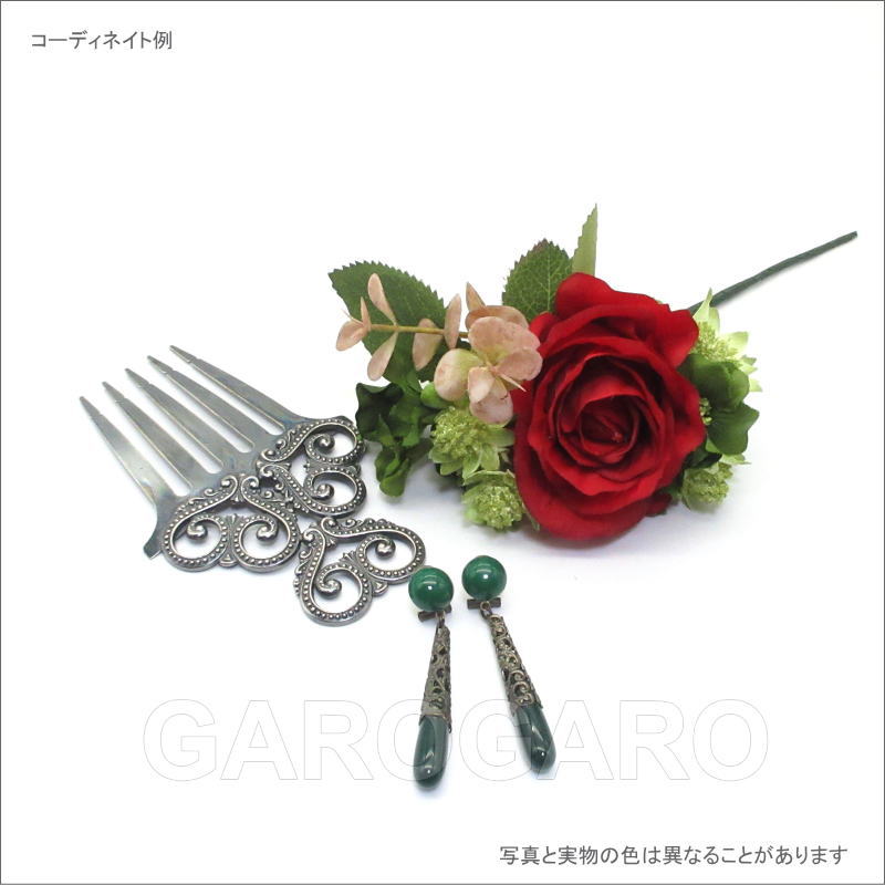 おすすめポイント: フラメンコを象徴する赤いバラにグリーン系の小花など3種類を合わせた贅沢なフローレスです。 モニョ(お団子頭)のサイドにつけやすいような形に整えて、ボリュームも少し控えめにしました。 --- 素材: 化繊、金属など サイズ(縦×横)cm: 花部分のサイズ 約12.5×7.0 (茎は含まず) (掲載のサイズは製品の実測値です。多少の個体差がありますがご容赦ください。) 【コーディネイト例】 ・メタルのペイネタ(櫛) Amor(アモール) 色:銀古美 ・イヤリング(ピアス) Jazmin(ハスミン) 色:深緑 |