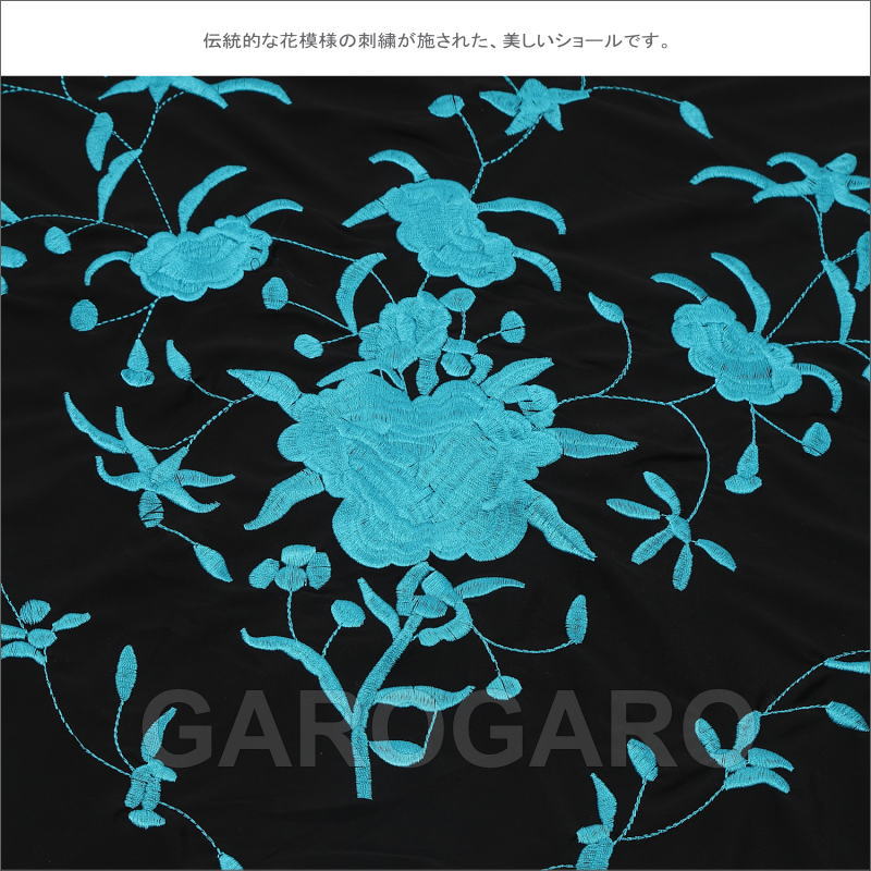マドローニョのついた刺繍のショール Jardin(ハルディン) 黒×中央の花:オレンジ系[フラメンコ用][スペイン直輸入]