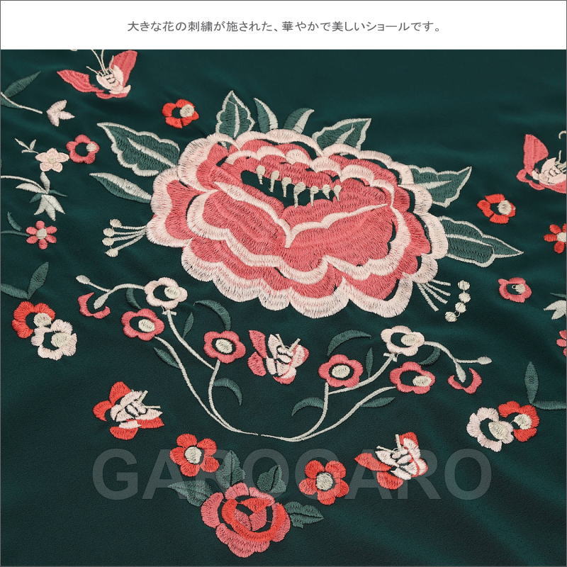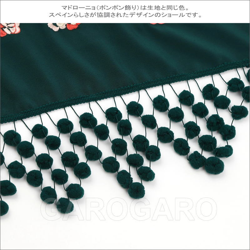 マドローニョのついた刺繍のショール Jardin(ハルディン) 深緑×中央の花:ピンク系×蝶:ワイン系[フラメンコ用][スペイン直輸入]