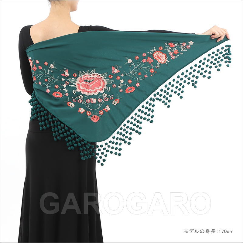 おすすめポイント: 中央に大きなバラの花の刺繍を施した、伝統的なデザインの豪華なマントンシージョ(三角形のショール)です。 スペインの民族衣装に使われる「マドローニョ」と呼ばれるポンポン飾りがポップな印象のショール。アレグリアスやガロティンなど、明るい曲調の曲に合いそうですね。 機械刺繍です。 --- 素材: 主にポリエステル サイズ(cm): 【長さ(首側の一番長い辺)】 約140cm 【縦の長さ (長辺から頂点まで)】60cm 【マドローニョ(ポンポン)幅】 最大値が約12cm (掲載のサイズは製品の実測値です。多少の個体差がありますがご容赦ください。) |