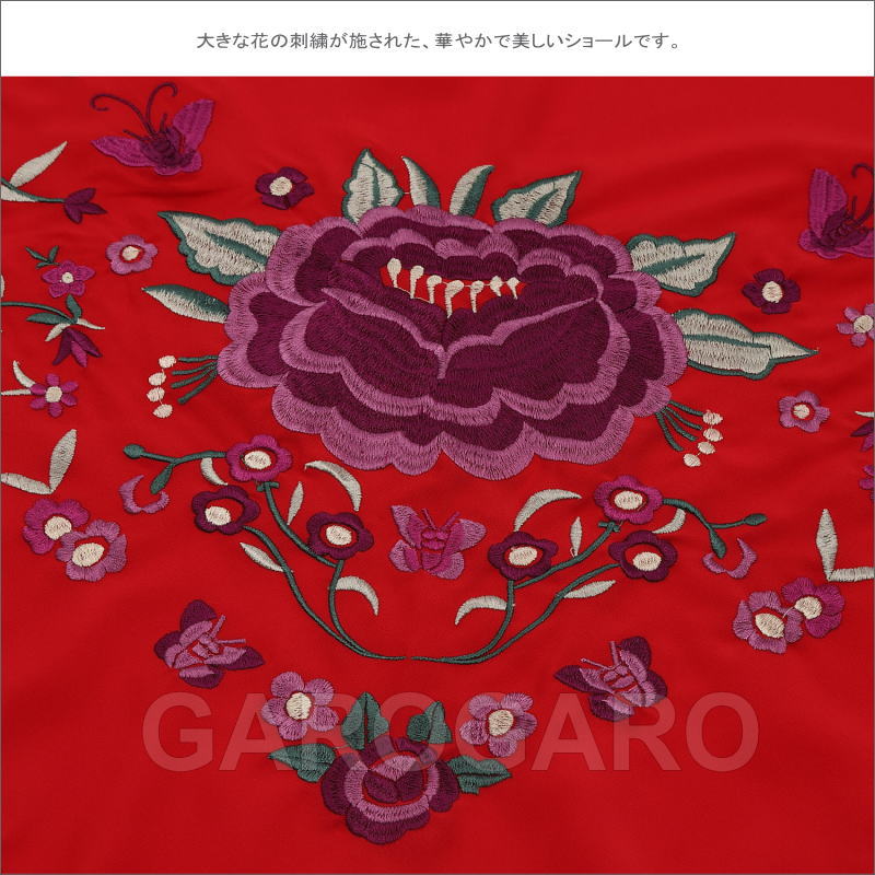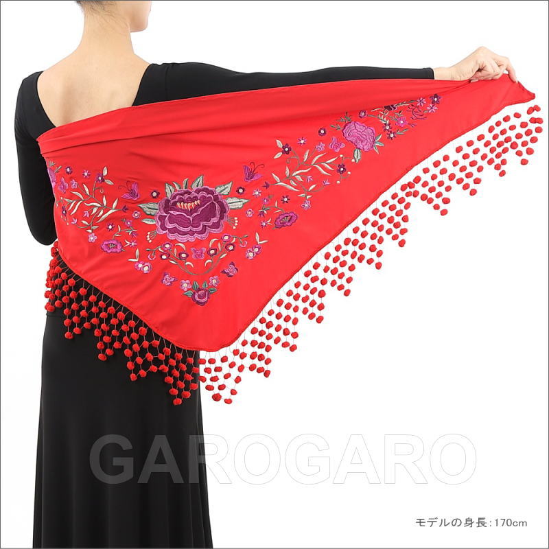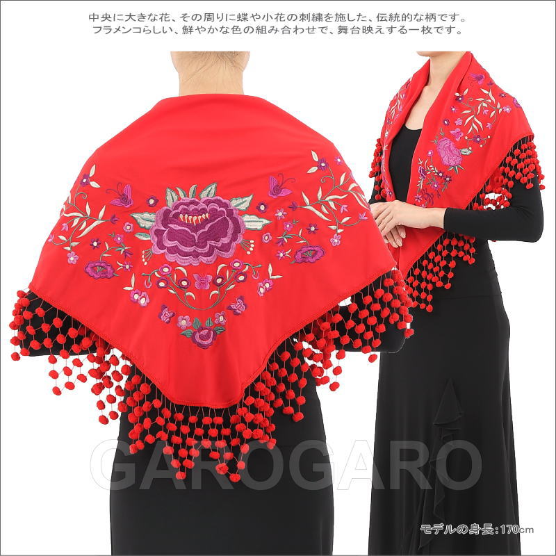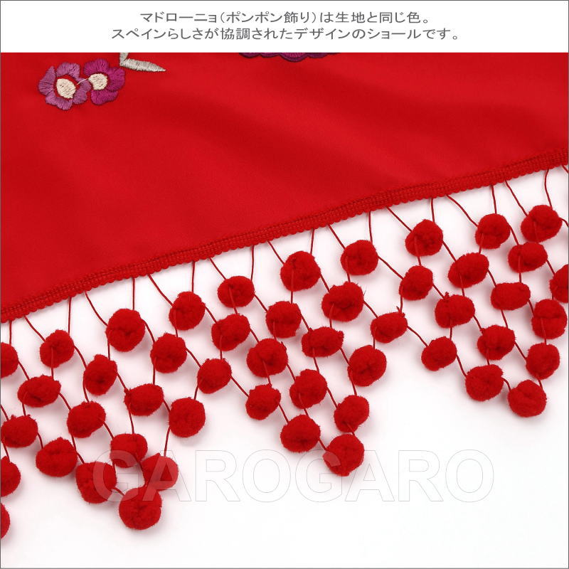 マドローニョのついた刺繍のショール Jardin(ハルディン) 赤×中央の花:ピンク系[フラメンコ用][スペイン直輸入]