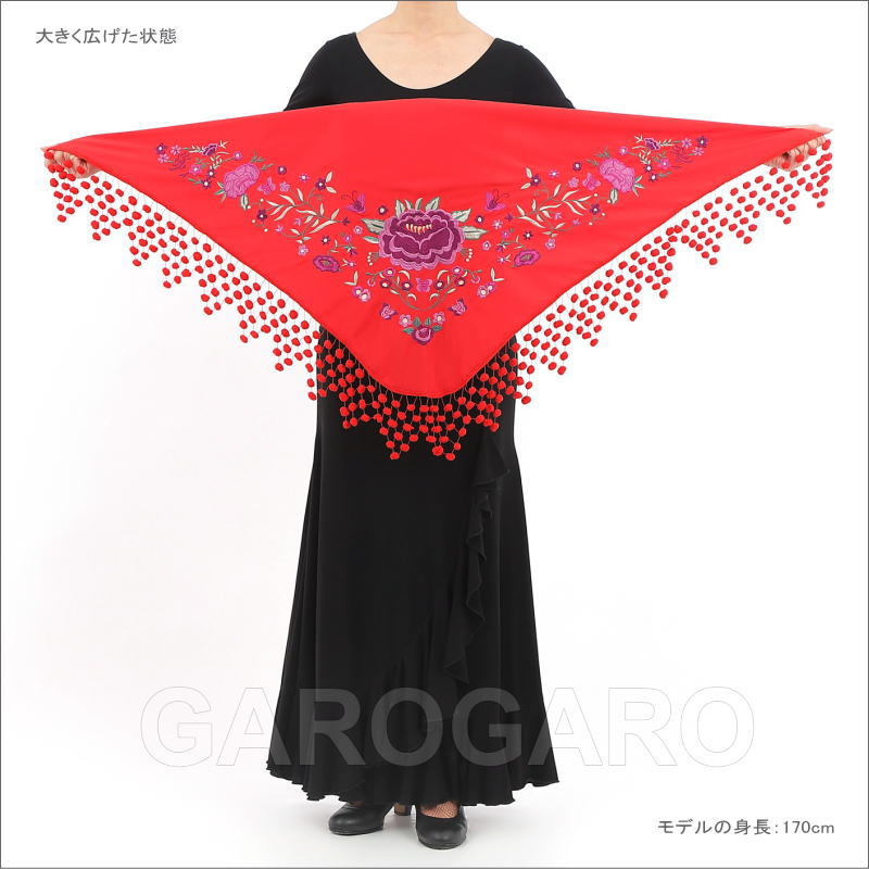 おすすめポイント: 中央に大きなバラの花の刺繍を施した、伝統的なデザインの豪華なマントンシージョ(三角形のショール)です。 スペインの民族衣装に使われる「マドローニョ」と呼ばれるポンポン飾りがポップな印象のショール。アレグリアスやガロティンなど、明るい曲調の曲に合いそうですね。 機械刺繍です。 --- 素材: 主にポリエステル サイズ(cm): 【長さ(首側の一番長い辺)】 約140cm 【縦の長さ (長辺から頂点まで)】60cm 【マドローニョ(ポンポン)幅】 最大値が約12cm (掲載のサイズは製品の実測値です。多少の個体差がありますがご容赦ください。) |