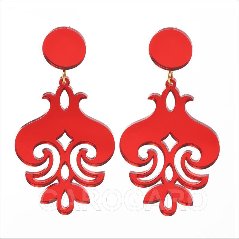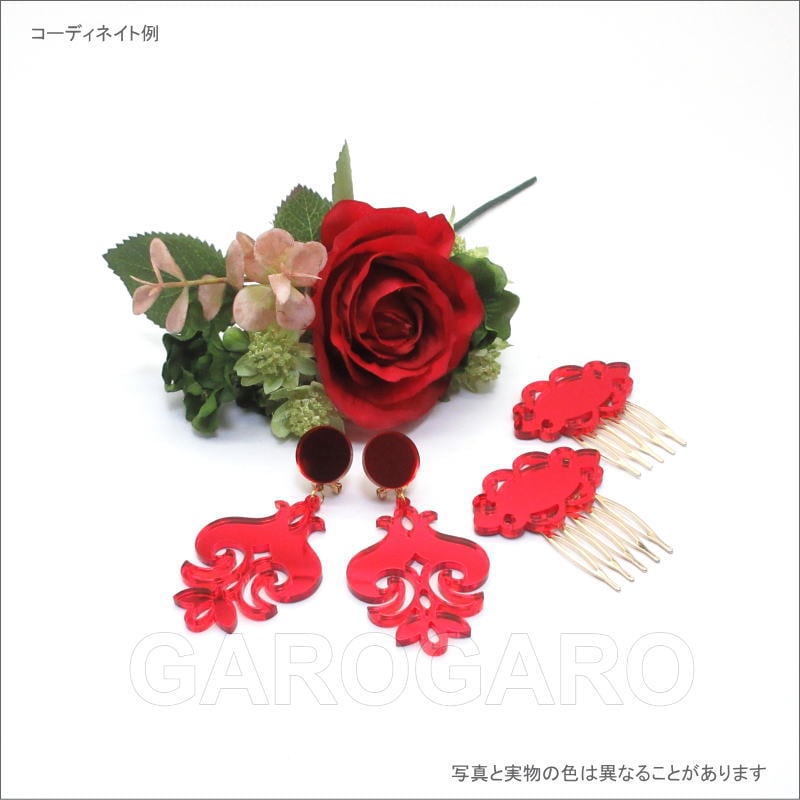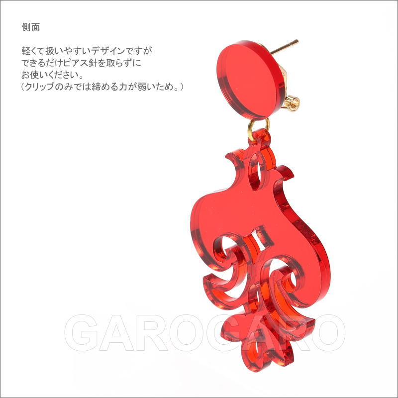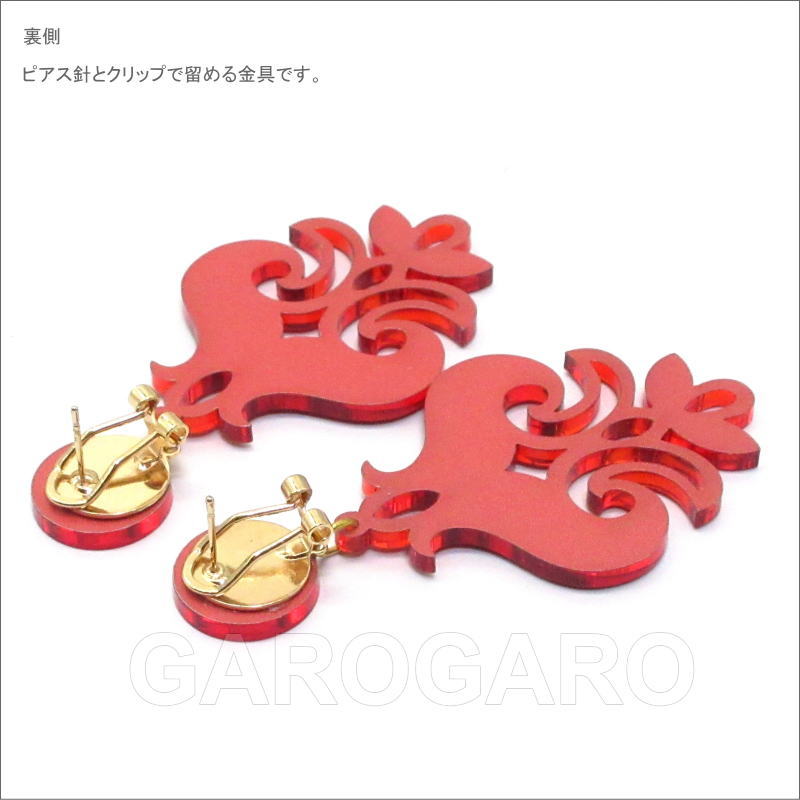 おすすめポイント: 大胆なアラベスク模様がエキゾチックなピアスです。 クリアなアクリル板のような素材の裏に、光を通さない塗料を塗って、鏡のように仕上げています。 光の当たる角度によって、キラッと光ったり、赤い影がこぼれたりする、技ありの新素材を使用しています。 --- 【ピアス針つき】ピアス針とクリップが両方ついたスペインの留め具を使用しています。 --- 素材: プラスチック・金属 サイズ(縦の長さ×横幅)cm: 約7.6(飾り部分の長さ:5.6)×3.9 (掲載のサイズは製品の実測値です。多少の個体差がありますがご容赦ください。) 【コーディネイト例】 ・ペイネシージョ(小さな櫛) Espejo(エスペッホ) 色:赤 ・赤いバラの花束風 KA-1 赤×グリーン |