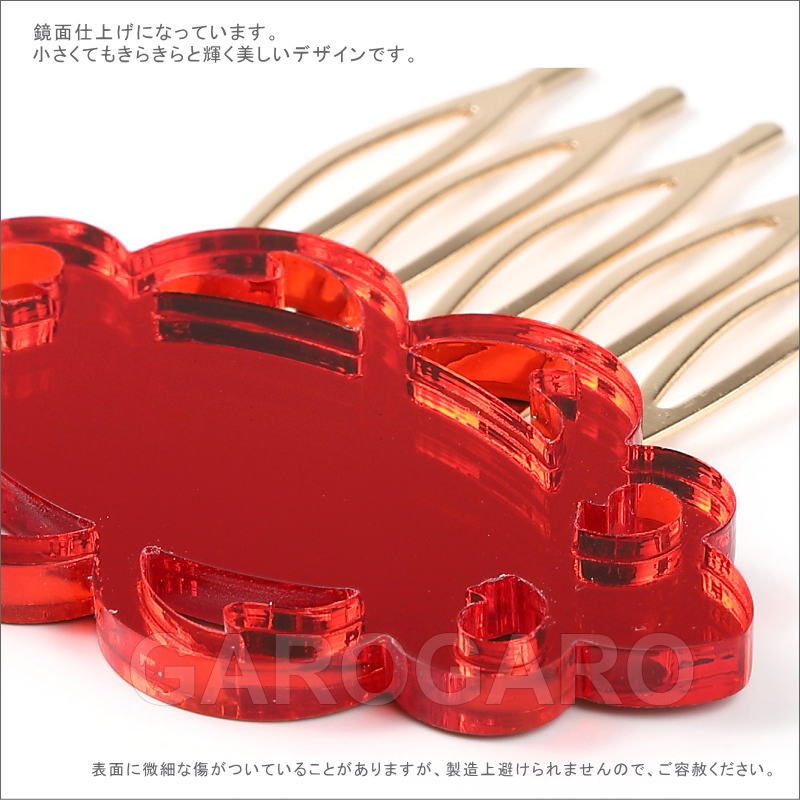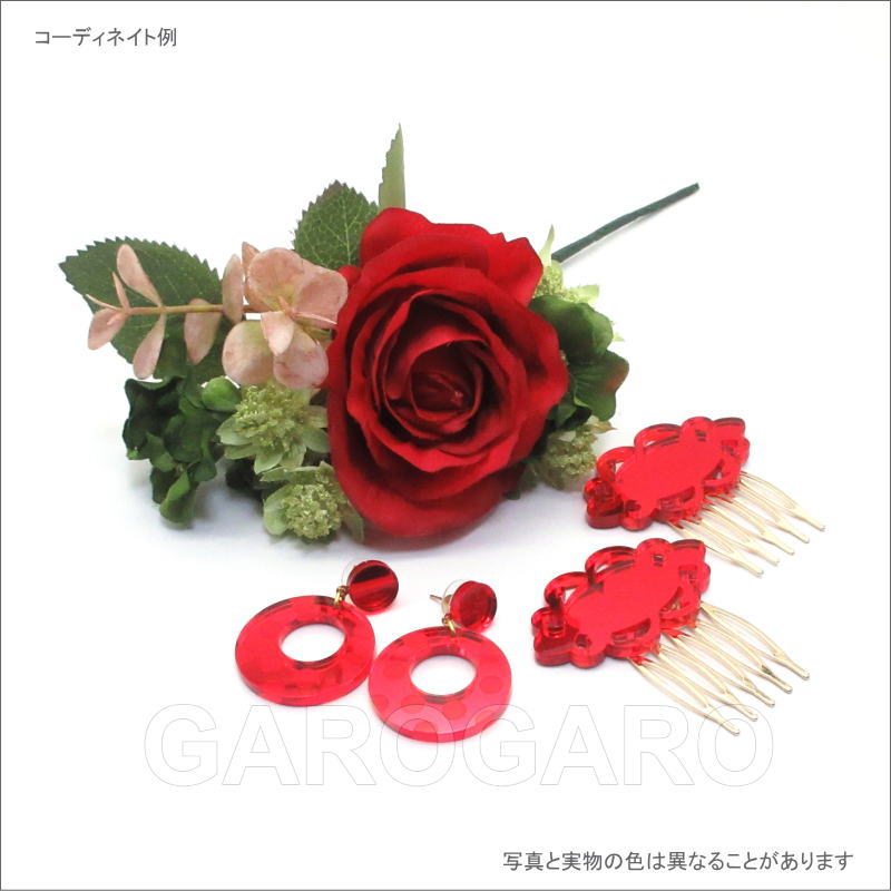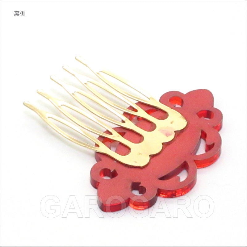 おすすめポイント: 2、3個重ね付けして使う、とても小さなペイネシージョ(小さな櫛)です。 クリアなアクリル板のような素材の裏に、光を通さない塗料を塗って、鏡のように仕上げています。 光の当たる角度によって、キラッと光ったり、赤い影がこぼれたりする、技ありの新素材を使用しています。 早い曲調やアバニコ(扇)を使う曲の時には、このような頭に沿うようにつけられる小型の櫛がおすすめです。 --- 素材: プラスチック・金属 サイズ(縦×横)cm: 約5.5(飾りのみの高さ:2.9)×5.0 (掲載のサイズは製品の実測値です。多少の個体差がありますがご容赦ください。) 【コーディネイト例】 ・水玉の小さなピアス Anillo(アニージョ) 色:赤 ・赤いバラの花束風 KA-1 赤×グリーン |