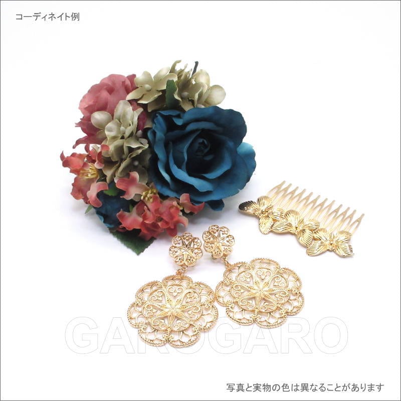 おすすめポイント: 以前はシルバー色が多かったフラメンコのアクセサリですが、最近は華やかなゴールド色もとても人気があります。 かわいらしい蝶はリボンのモチーフのようにも見えて、遊び心のあるデザインです。2枚重ね付けをしても華やかなペイネシージョ(小さな櫛)です。 --- 素材: 金属 サイズ(縦×横)cm: 約5.1(飾り部分の高さ:約2.3)×8.2 (掲載のサイズは製品の実測値です。多少の個体差がありますがご容赦ください。) 【コーディネイト例】 ・上品色のバラの花束風 HA-1 ブルー×くすみピンク系 ・メタルのイヤリングSeptenario(セプテナリオ) ゴールド |