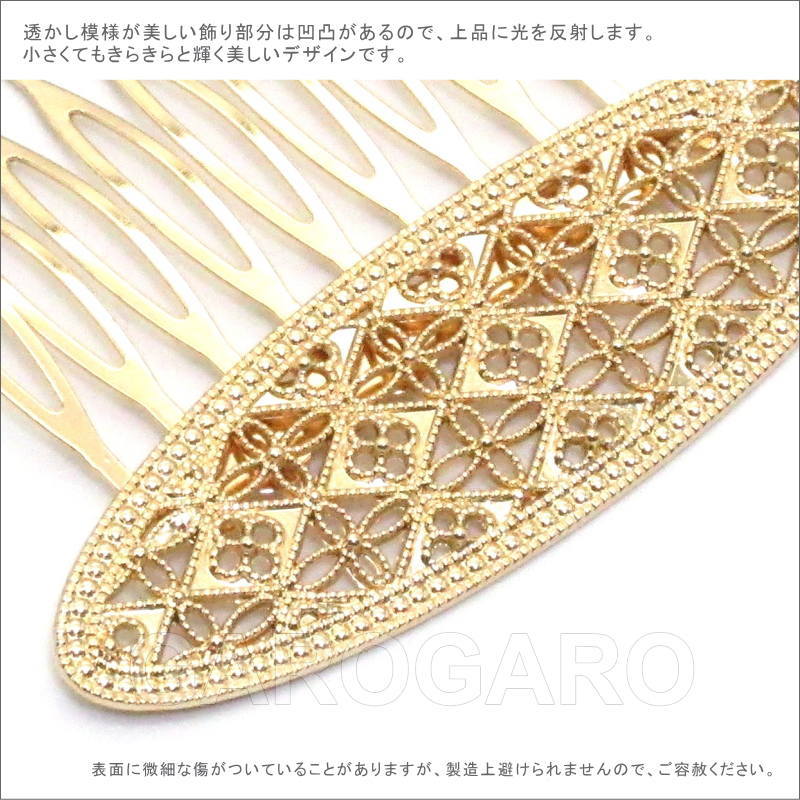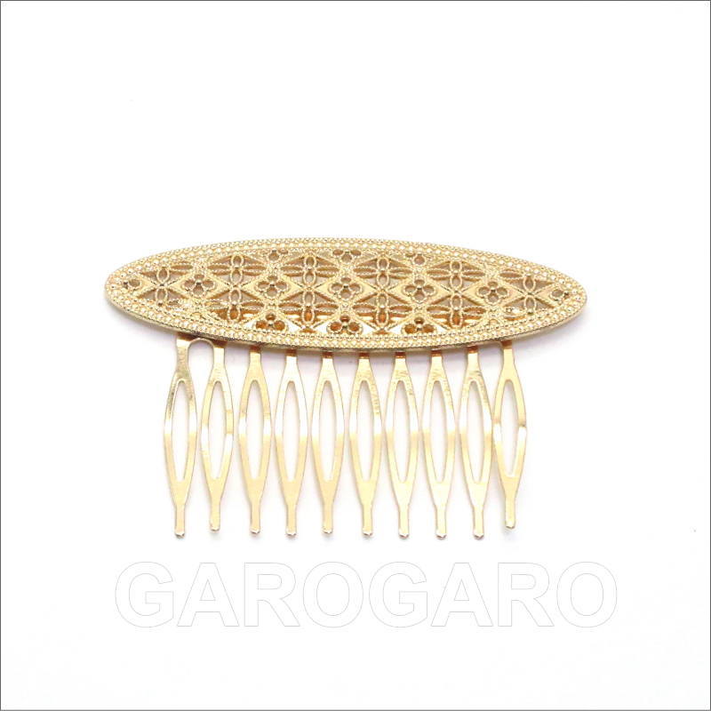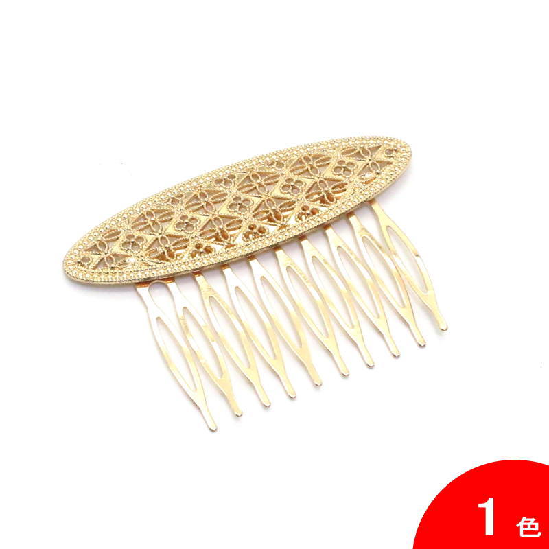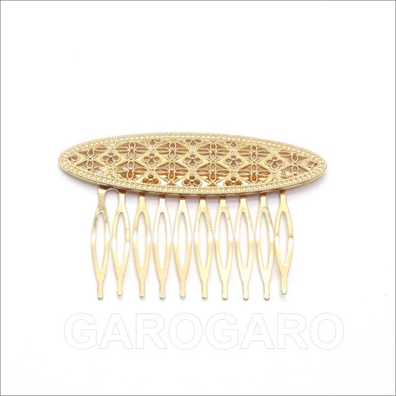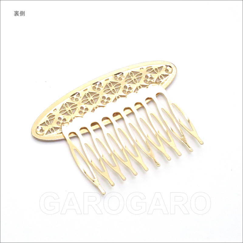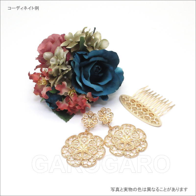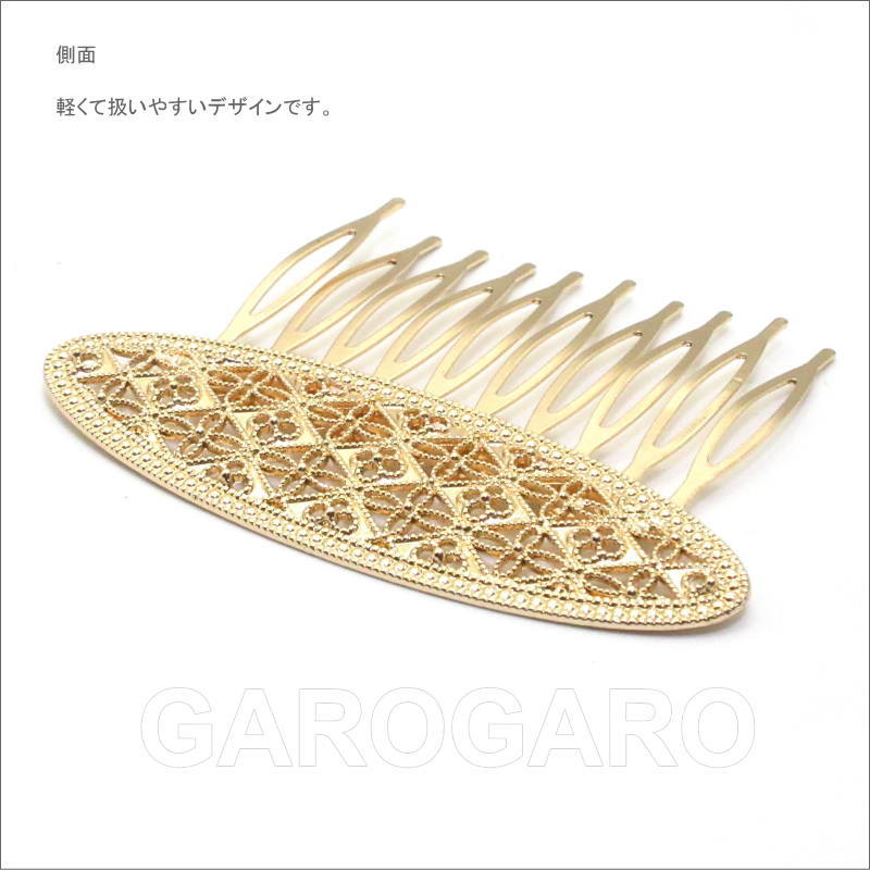 おすすめポイント: 以前はシルバー色が多かったフラメンコのアクセサリですが、最近は華やかなゴールド色もとても人気があります。 オーバル型の飾りは、繊細な透かし模様になっていて、とてもエレガントなデザイン。小型なので2~3枚重ね付けをしても華やかなペイネシージョ(小さな櫛)です。 --- 素材: 金属 サイズ(縦×横)cm: 約5.3(飾り部分の高さ:約2.0)×7.5 (掲載のサイズは製品の実測値です。多少の個体差がありますがご容赦ください。) 【コーディネイト例】 ・上品色のバラの花束風 HA-1 ブルー×くすみピンク系 ・メタルのイヤリングSeptenario(セプテナリオ) ゴールド |
