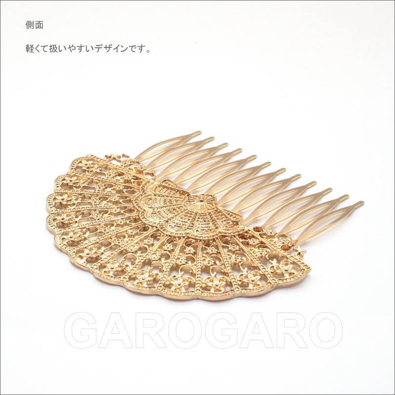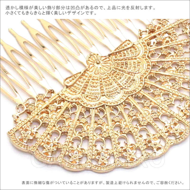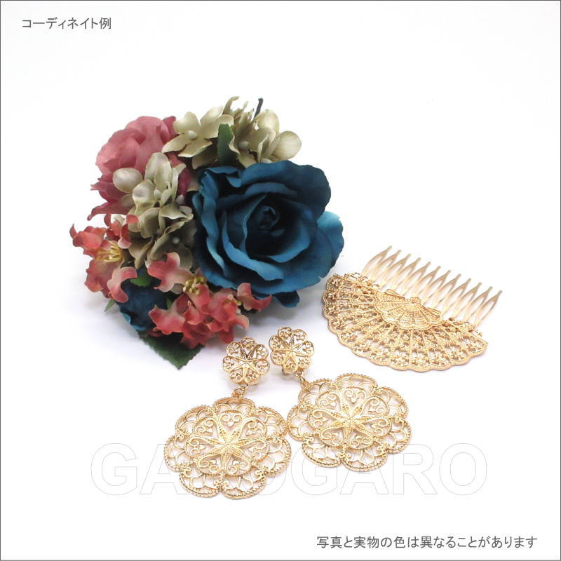 おすすめポイント: 以前はシルバー色が多かったフラメンコのアクセサリですが、最近は華やかなゴールド色もとても人気があります。 古くは日本からスペインに輸出されていた扇(Abanico)は、フラメンコのアクセサリでも広く用いられるモチーフです。エレガントな透かし模様が素敵です。少し大きめなので、1枚でも十分に華やかなペイネシージョ(小さな櫛)です。 --- 素材: 金属 サイズ(縦×横)cm: 約7.4(飾り部分の高さ:約4.5)×8.4 (掲載のサイズは製品の実測値です。多少の個体差がありますがご容赦ください。) 【コーディネイト例】 ・上品色のバラの花束風 HA-1 ブルー×くすみピンク系 ・メタルのイヤリングSeptenario(セプテナリオ) ゴールド |