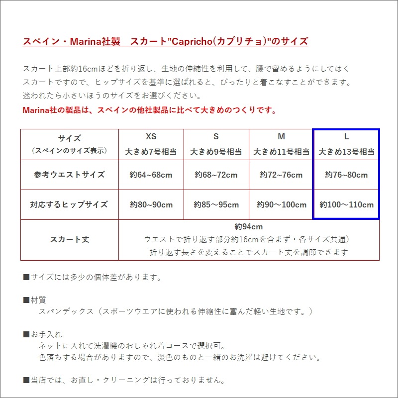 おすすめポイント: フラメンコの本場セビリヤから。 スペインだけでなく、日本でも人気の高いMarina社のスカートです。デザイナーが生地の色や柄から得たインスピレーションで、魅力的なレッスン用スカートを一点一点デザインしています。 軽くて持ち運びに便利なだけでなく、家で洗濯もできるところがポイント高し。 スカートの開きは控えめなので、下にレギンスなどの着用をおすすめします。 --- 素材: ポリエステル、ポリウレタンなど サイズ(cm): L(G) 詳しいサイズについてはサイズ表をご覧ください。 (掲載のサイズは製品の実測値です。多少の個体差がありますがご容赦ください。) |