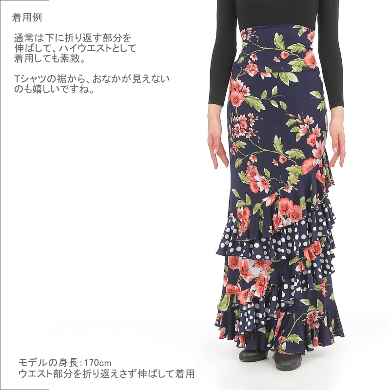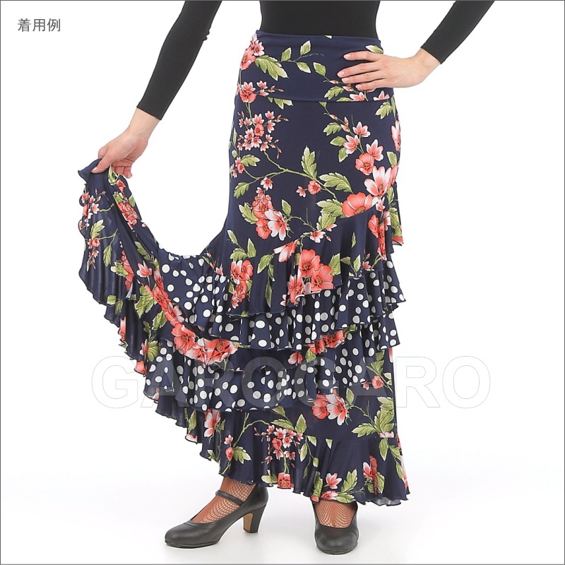 スカート Capricho(カプリチョ) モデル:A5-2 花柄 婦人用 サイズ:XS(XP) 紺×サーモン色のフリル[フラメンコ用][スペイン直輸入]
