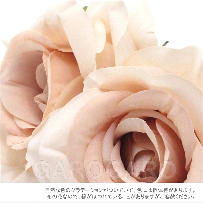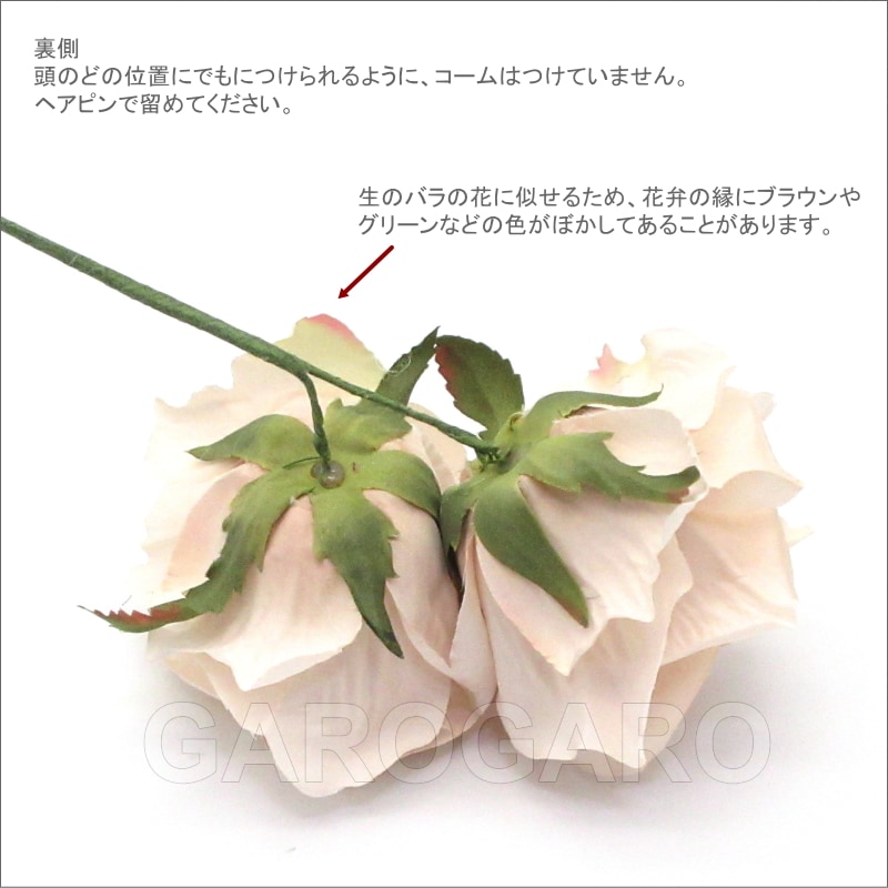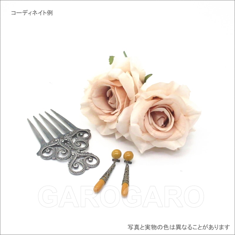 おすすめポイント: エレガントなピンクベージュ色のバラ。1輪ずつつけても十分な華やかさがあります。 頭の高い位置でも、サイドでもつけやすい大きさです。 --- 素材: 化繊、金属など サイズ(縦×横)cm: 花部分のサイズ 約15.0×10.5 花1輪の直径 約10.5(茎は含まず) (掲載のサイズは製品の実測値です。多少の個体差がありますがご容赦ください。) 【コーディネイト例】 ・メタルのペイネタ(櫛) Amor(アモール) 色:銀古美 ・イヤリング(ピアス) Jazmin(ハスミン) 色:マスタード |