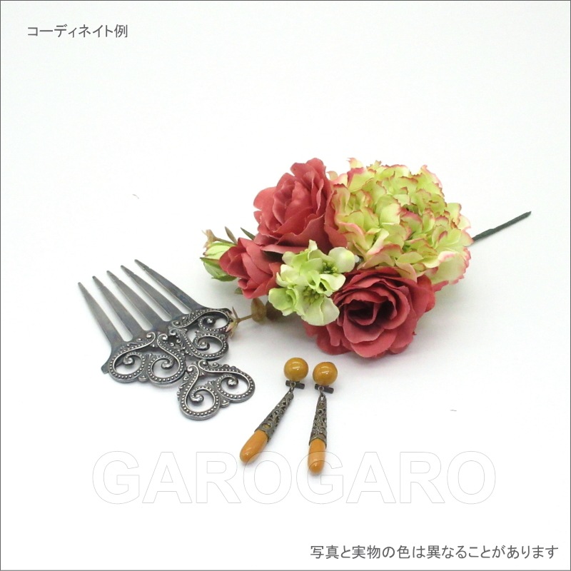 おすすめポイント: 大人気のくすみピンク色のバラと、青りんごのような色のグリーンの花をふんだんに使った贅沢なフローレスです。 モニョ(お団子頭)のサイドにつけやすいような形に整えました。 --- 素材: 化繊、金属など サイズ(縦×横)cm: 花部分のサイズ 約13.0×11.0 (茎は含まず) (掲載のサイズは製品の実測値です。多少の個体差がありますがご容赦ください。) 【コーディネイト例】 ・メタルのペイネタ(櫛) Amor(アモール) 色:銀古美 ・イヤリング(ピアス) Jazmin(ハスミン) 色:マスタード |