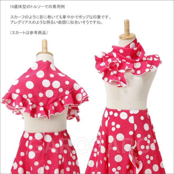 補足説明 お手入れ: ドライクリーニング(信頼のあるお店にご依頼ください) ・フレコ(フリンジ)が縮れたときには、スチームアイロン(中温)で伸ばすことができます。 ----- ・稀に水濡れなどで色移りする場合があります。 ・ご覧になるモニターによって、実物と写真の色合いが異なって見える場合があります。 ・縫い糸の端が出ていることがありますが、ほつれてしまいますので、切ったり引っ張ったりしないでください。 ・スペイン製です。縫製が多少雑なことがあります。糸つれ、色むらなどがあったり、縫製用の印などが残っている場合があります。大きく目立つ場合は検品時に取り除きますが、舞台でご使用するのに問題ないと判断できる程度である場合は良品と判断致します。あらかじめご了承下さい。 |