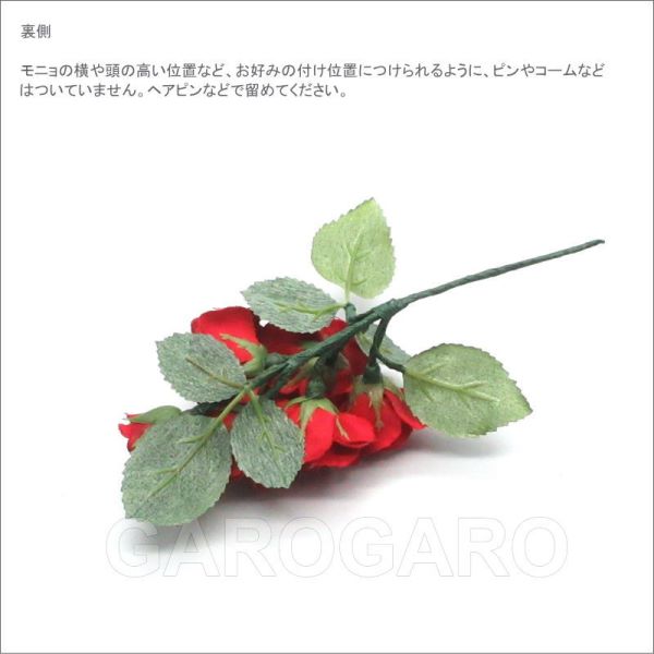 補足説明 ・モニョ(おだんごに結った髪型)の横や頭の高い位置など、お好みの付け位置につけられるように、ピンやコームなどはついていません。ヘアピンなどで留めてください。 ・ご覧になるモニターによって、実物と写真の色合いが異なって見える場合があります。 ・衛生上の理由から、商品が入った透明な袋を開封後は返品、交換ができません。 ・布製の造花なので、端にほつれや染ムラがあることがあります。 ・入荷時期によって、花の大きさや色合い、花束風の商品は花の配置、小花や葉の個数がわずかに異なることがあります。 大きく目立つ場合は検品時に取り除きますが、舞台でご使用するのに問題ないと判断できる程度である場合は良品と判断致します。あらかじめご了承下さい。 ・稀に水濡れなどで色落ちする場合があります。ご注意ください。 |