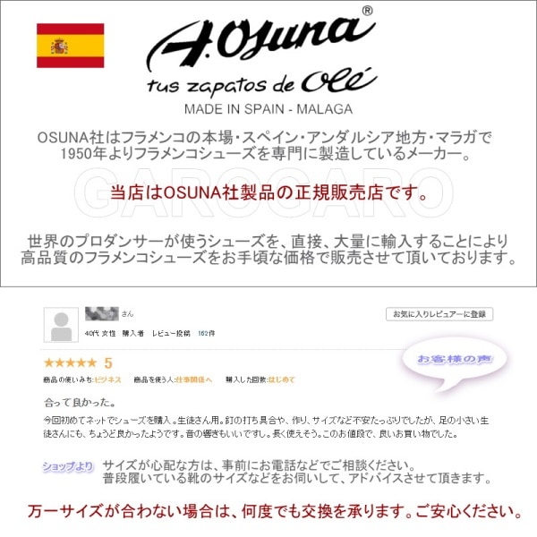 ★アウトレット品です★ 使用に問題はありませんが、入荷してから5年以上経過している商品です。 在庫限りで販売終了予定の売り切り商品です。 返品交換は可能ですが、在庫がわずかで、同じ商品の他のサイズへの交換が難しいため、お客様都合での返品か、別の商品への交換になります。 当店がわけありと判断した商品については、さらにお値引きしております。 以上ご理解の上、ご注文ください。 --- おすすめポイント: 初めてのフラメンコシューズに最適な釘のついた入門用シューズです。 中級者も満足のできる品質です。 ゴムベルトのシューズは、着脱が楽で早く出来る、バックルが無いのでマントンなどのフレコ(フリンジ) が引っ掛からないというような利点があります。 OSUNA(オスーナ) は、日本人にうれしい、幅の広い木型で作られています。 足に馴染みやすい柔らかい革質です。 サイズ交換は何度でも承ります。遠慮なくご相談ください。 同じ商品とのサイズ交換はできない場合は、在庫のある他のモデルへの交換などで対応可能です。 --- 素材: 牛革 Piel (表皮) サイズ(cm): 選択オプションに記載の対応日本サイズをご確認ください。 (掲載のサイズは製品の実測値です。多少の個体差がありますがご容赦ください。) |