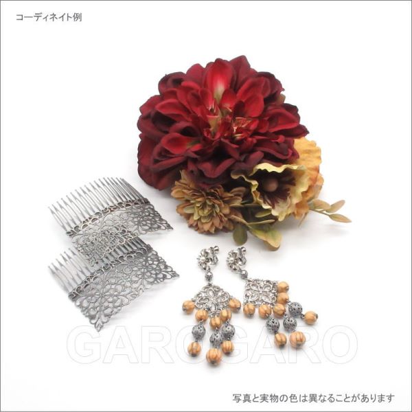 おすすめポイント: PERIS社製。繊細な色合いとデザインのエレガントなイヤリングです。 クールなシルバーをベースにしているので、コーディネートの幅も広がります。 --- 【ピアス針なし】クリップとねじで留める日本式の留め具を使用しています。 【在庫限り】 --- 素材: プラスチック・金属 サイズ(縦の長さ×横幅)cm: 約8.5(飾り部分の長さ:7.0)×3.0 (掲載のサイズは製品の実測値です。多少の個体差がありますがご容赦ください。) 【コーディネイト例】 ・メタルのペイネシージョ(小さな櫛) Begonia(ベゴニア) 色:銀古美 ・ワイン色の大きなダリアの花束風 EA-51 |