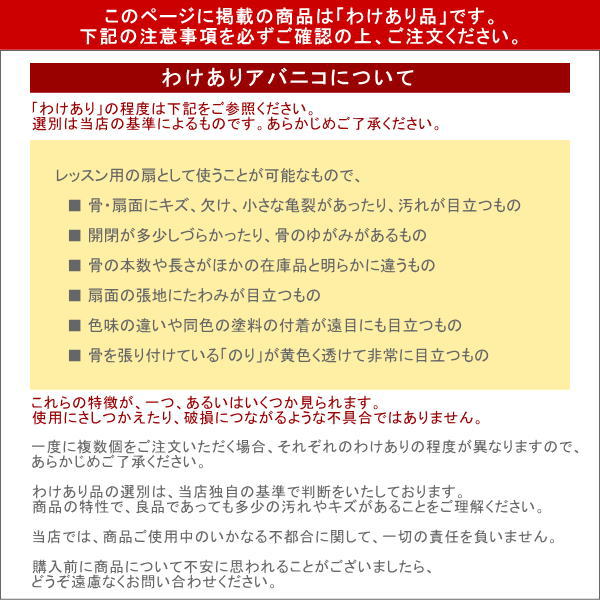 補足説明 製造元の都合により、長期欠品、または製造終了になる恐れがあります。本番用にできるだけ予備をご用意ください。 使用している塗料は耐水性の塗料ですが、まれに、摩擦や水濡れなどにより、色落ち・色移りがある場合がございます。長時間濡れた衣類と一緒にしないでください。 天然の木を使い、手加工で仕上げる扇のため、以下の点は免責とさせて頂きます。どうぞご容赦ください。 ・塗装のむら、製造時に表面についた小さな傷、ささくれなどがある場合がございます。 ・天然の木材を使用しておりますので、骨組みに反りがあったり、不ぞろいだったりします。 ・入荷時期によって色合いが異なったり、ペイントや透かし彫り、レースがある扇の場合はこれらの色や柄などが掲載画像と異なることがあります。 ・淡色の張地の場合、骨を貼り付ける接着剤や骨組み自体の色が透けて見えます。また、ペイントが裏にしみて見えることがあります。 ダンス用小物としてご利用いただく上で問題になる不具合がある商品は、発送時の検品で取り除いています。ご安心ください。 |