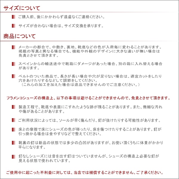 補足説明 ・メーカーの都合で、中敷き、裏地、靴底などの色が入荷毎に変わることがあります。掲載の写真と異なる場合でも、機能や外観のデザインに大きな違いが無い場合は免責とさせて頂きます。 ・製造工程で、靴底や表面にこすれたような跡が残ることがあります。また、微細な汚れや傷があることがあります。ご容赦ください。 ・スペインからの輸送中に、外箱が型崩れすることがあります。崩れの大きなものは当店にて箱を変えてお届けいたします。 ・屋内での使用を想定して作られています。野外や摩擦の大きな床でご使用頂くと、ソールが早く傷んだり、釘が抜けたりする原因になります。 ・ご使用中に起こった不利益に対しては、当店では補償することができません。ご了承ください。 |