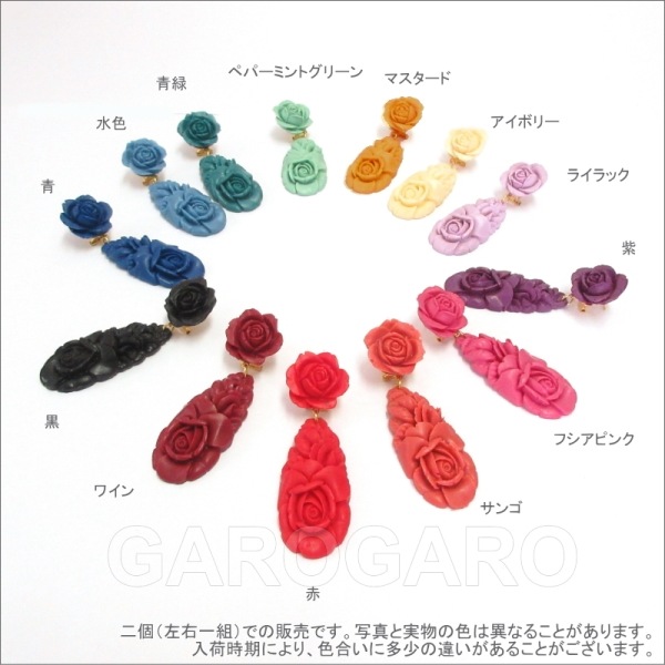 おすすめポイント: 大人色のバラのモチーフがエレガントなイヤリング(ピアス)です。 モチーフ使いで子供っぽくならないように、あえて少し落ち着いた大人の色を選びました。 耳に咲いた美しいバラが気分を高めてくれます。 --- 【ピアス針つき】ピアス針とクリップが両方ついたスペインの留め具を使用しています。 --- 素材: プラスチック・金属 サイズ(縦の長さ×横幅)cm: 約8.2(飾り部分の長さ:5.5)×2.6 (掲載のサイズは製品の実測値です。多少の個体差がありますがご容赦ください。) 【コーディネイト例】 ・メタルのペイネシージョ(小さな櫛) Camelia(カメリア) 色:ゴールド ・花束風コサージュ Memoria (メモリア) 色:アンティークブルー |