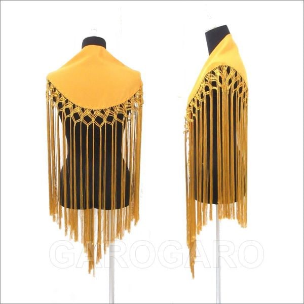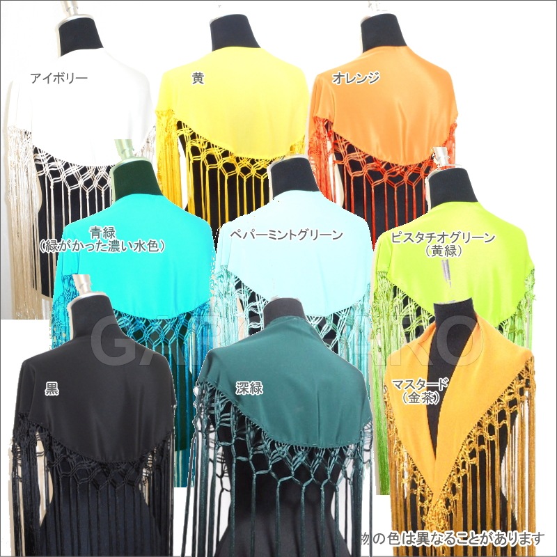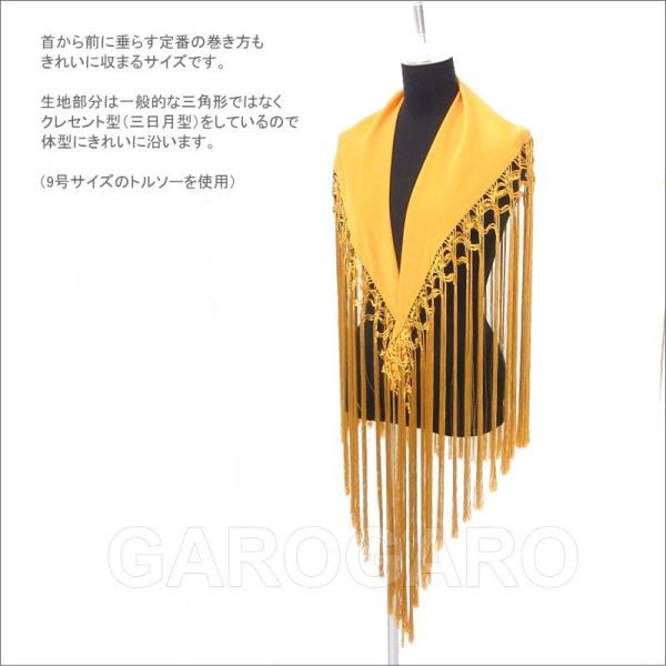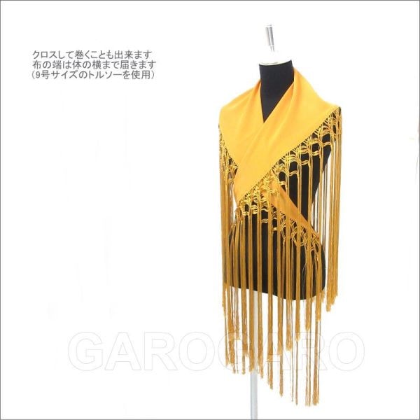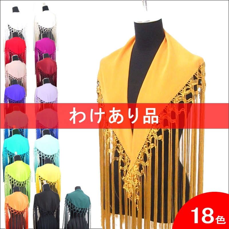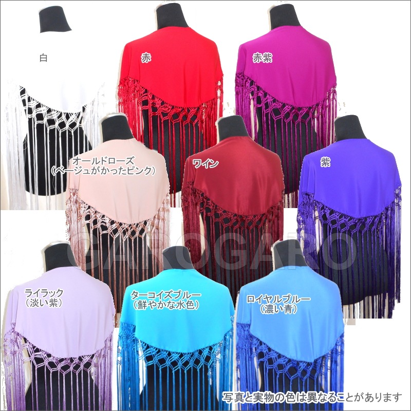 補足説明 お手入れ: ドライクリーニング(信頼のあるお店にご依頼ください) ・布地部分は水洗い(手洗い)可能ですが、フレコ(フリンジ)の水洗いは避けてください。 ・フレコ(フリンジ)が縮れたときには、スチームアイロン(中温)で伸ばすことができます。 ----- ・布地とフレコの糸の色合いが多少異なる場合がありますがご容赦ください。 ・フレコと生地がこすれる部分が白っぽく見える跡がついてしまうことがありますが、これは素材の特性で避けられません。 ・稀に水濡れなどで色移りする場合があります。 ・ご覧になるモニターによって、実物と写真の色合いが異なって見える場合があります。 ・縫い糸の端が出ていることがありますが、ほつれてしまいますので、切ったり引っ張ったりしないでください。 ・スペイン製です。縫製が多少雑なことがあります。糸つれ、色むらなどがあったり、縫製用の印などが残っている場合があります。大きく目立つ場合は検品時に取り除きますが、舞台でご使用するのに問題ないと判断できる程度である場合は良品と判断致します。あらかじめご了承下さい。 |