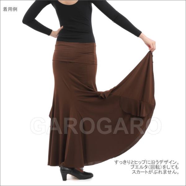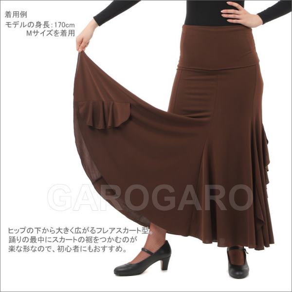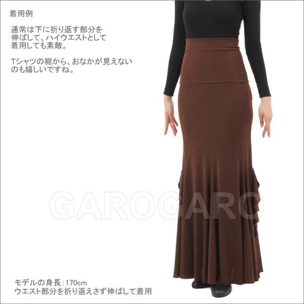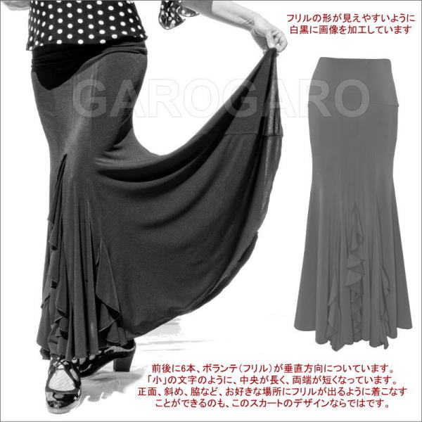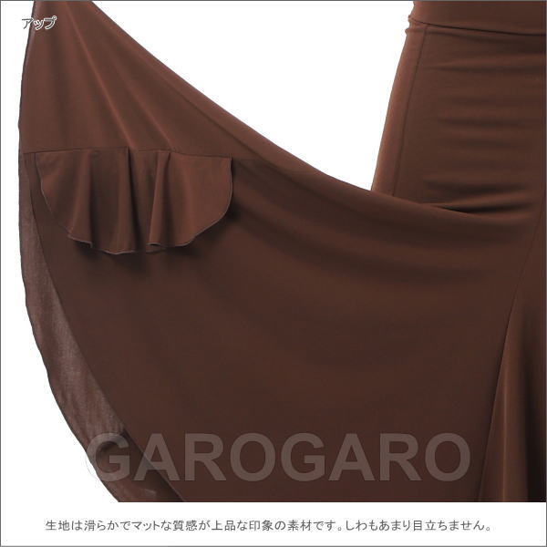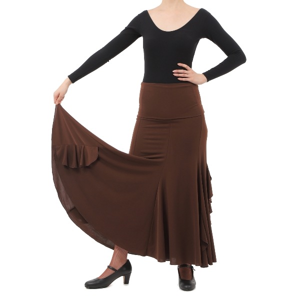 おすすめポイント: セビージャ発。前後に6本、バーティカルについたフリルがクールな印象の、腰で着こなすフレアスカート。初心者でも、踊りの最中にスカートが取りやすいように、フレアが広がる位置を高めに仕上げました。 あまり明るい色はレッスン着に選ばない方でも、抵抗なく着ることができる落ち着いたブラウンです。「チョコレートブラウン」よりもやや明るい色合いです。 生地の伸縮性を生かし、腰で留めてはくスカートです。日本人向けにやや細身に仕立てました。 --- 素材: ポリエステル・ポリウレタンなど サイズ(cm): XS・S・M・L 詳しいサイズについてはサイズ表をご覧ください。 (掲載のサイズは製品の実測値です。多少の個体差がありますがご容赦ください。) |