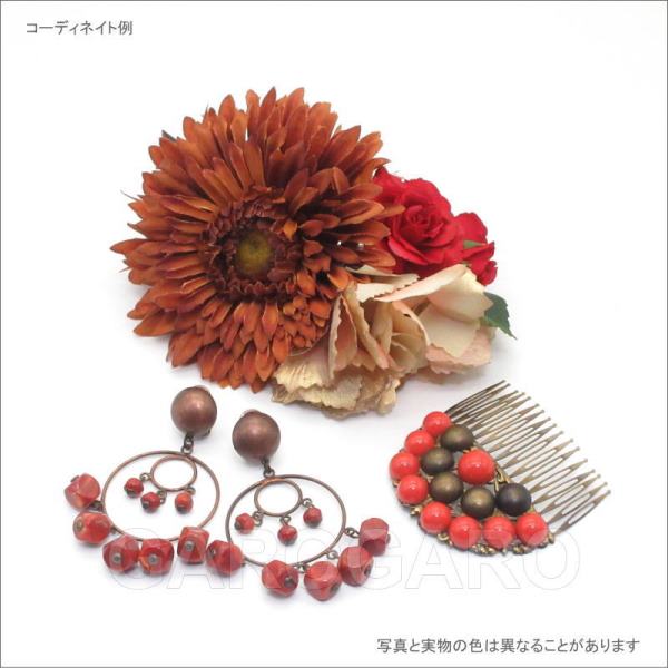 おすすめポイント: 上品な大人色の花を流行の花束風髪飾りに仕立てました。 メインの花はブロンズ色(やや赤みのあるブラウン)のガーベラです。 同系色のブロンズ色やゴールドのアクセサリとの相性が抜群です。 赤みのあるガーベラの色の魅力を損なわないように、同系色の赤いバラやゴールドをまとった淡いピンクのハイドランジアを合わせました。 --- 【在庫限り】 --- 素材: 化繊、金属など サイズ(cm): 花部分の大きさ 約12.5×10.5 (掲載のサイズは製品の実測値です。多少の個体差がありますがご容赦ください。) 【コーディネイト例】 ・メタルのペイネシージョ (小さな櫛) Coral (コラール) 色:コラール ・ブロンズ色のイヤリング Marta(マルタ) 色:サンゴ |