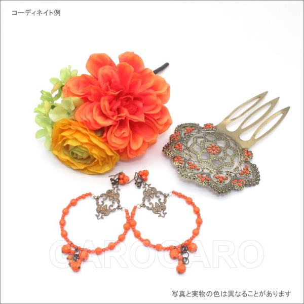 おすすめポイント: アンティーク風のメタルの透かしパーツときれいな色のビーズの組み合わせ。 色のバリエーションもあって、群舞にもおすすめのイヤリング(ピアス)です。 非常に軽くてコンパクト。早い曲調の場合でも気になりません。 --- 【ピアス針つき】ピアス針とクリップが両方ついたスペインの留め具を使用しています。 --- 素材: プラスチック・金属 サイズ(縦の長さ×横幅)cm: 約11.0(飾り部分の長さ:9.5)×5.8 (掲載のサイズは製品の実測値です。多少の個体差がありますがご容赦ください。) 【コーディネイト例】 ・オレンジのダリアとビタミンカラーの花の花束風 BN-22 ・メタルのペイネタ (櫛) Luminaria (ルミナリア) 色:サンゴ |