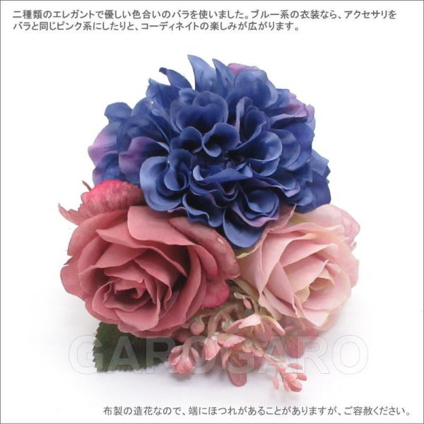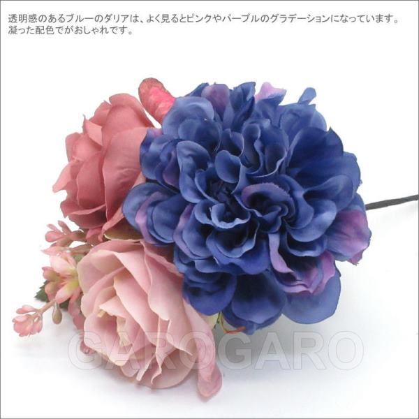 おすすめポイント: 上品な大人色の花を流行の花束風髪飾りに仕立てました。 透明感のあるブルーのダリアは、よく見るとピンクやパープルのグラデーションになっています。 凝った配色でがおしゃれです。 二種類のエレガントで優しい色合いのバラを使いました。 ブルー系の衣装なら、アクセサリをバラと同じピンク系にしたりと、コーディネイトの楽しみが広がります。 --- 【在庫限り】 --- 素材: 化繊、金属など サイズ(cm): 花部分の大きさ 約13.0×11.0 (掲載のサイズは製品の実測値です。多少の個体差がありますがご容赦ください。) 【コーディネイト例】 ・ペイネタ参考商品 ・イヤリング参考商品 |