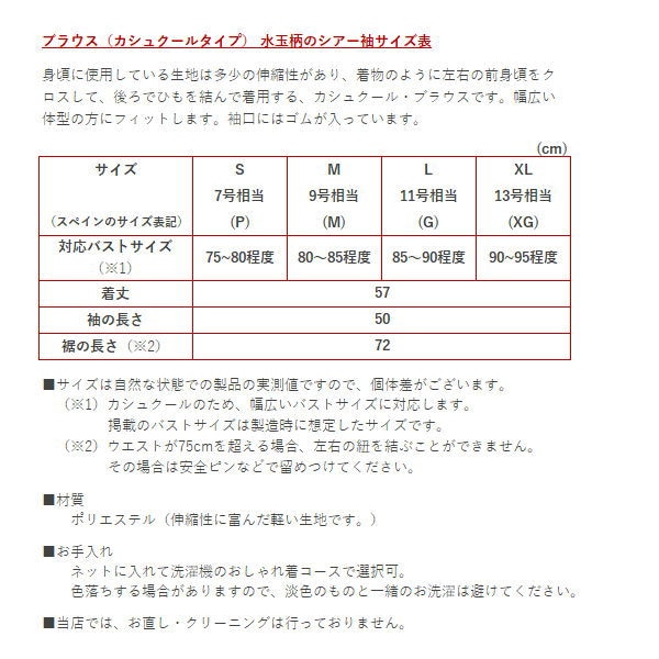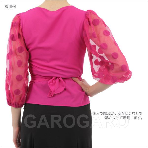 おすすめポイント: ■カシュクールタイプ■ 着物のように左右の前身頃をクロスして、後ろでひもを結んで着用する、カシュクール・ブラウスです。幅広い体型の方にフィットします。 右脇に紐を通す穴が開いています。 裏地はついていません。下着には同色や肌に近い色のブラトップなどを着用することをお勧めします。 ■袖■ 袖口にゴムが入っています。5分~7分袖の長さです。 袖には透け感のある生地を使っています。水玉模様部分は起毛しているオパール加工です。舞台のライトに当たると上品に水玉模様が浮き出ますが、単純に色を違えてプリントされた水玉ではないので、ほかの柄のスカートなどと合わせても嫌みが無く、合わせやすいブラウスです。 【在庫限り】 --- 素材: ポリエステル (伸縮性に富んだ軽い生地です。) サイズ(cm): XS・S・M・L 詳しいサイズについてはサイズ表をご覧ください。 (掲載のサイズは製品の実測値です。多少の個体差がありますがご容赦ください。) |
