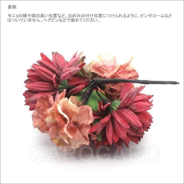 補足説明 ・モニョ(おだんごに結った髪型)の横や頭の高い位置など、お好みの付け位置につけられるように、ピンやコームなどはついていません。ヘアピンなどで留めてください。 ・ご覧になるモニターによって、実物と写真の色合いが異なって見える場合があります。 ・衛生上の理由から、商品が入った透明な袋を開封後は返品、交換ができません。 ・布製の造花なので、端にほつれや染ムラがあることがあります。 ・入荷時期によって、花の大きさや色合い、花束風の商品は花の配置、小花や葉の個数がわずかに異なることがあります。 大きく目立つ場合は検品時に取り除きますが、舞台でご使用するのに問題ないと判断できる程度である場合は良品と判断致します。あらかじめご了承下さい。 ・稀に水濡れなどで色落ちする場合があります。ご注意ください。 |