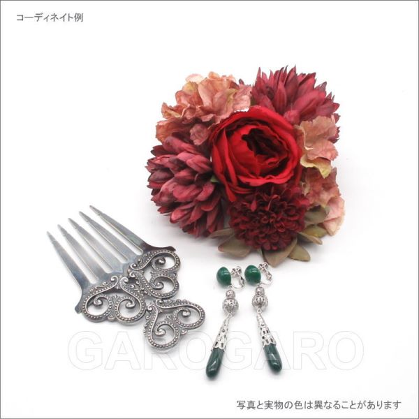 おすすめポイント: 上品な大人色の花を流行の花束風髪飾りに仕立てました。 深い赤色を中心とした組み合わせがフラメンコらしさを出しています。 頭の高い位置につけるのにちょうど良い、ラウンド型です。 --- 素材: 化繊、金属など サイズ(cm): 花部分の直径 約12.0 (掲載のサイズは製品の実測値です。多少の個体差がありますがご容赦ください。) 【コーディネイト例】 ・イヤリング Penelope(ペネロペ) 色:深緑 ・メタルのペイネタ(櫛) Amor(アモール) 色:銀古美 |