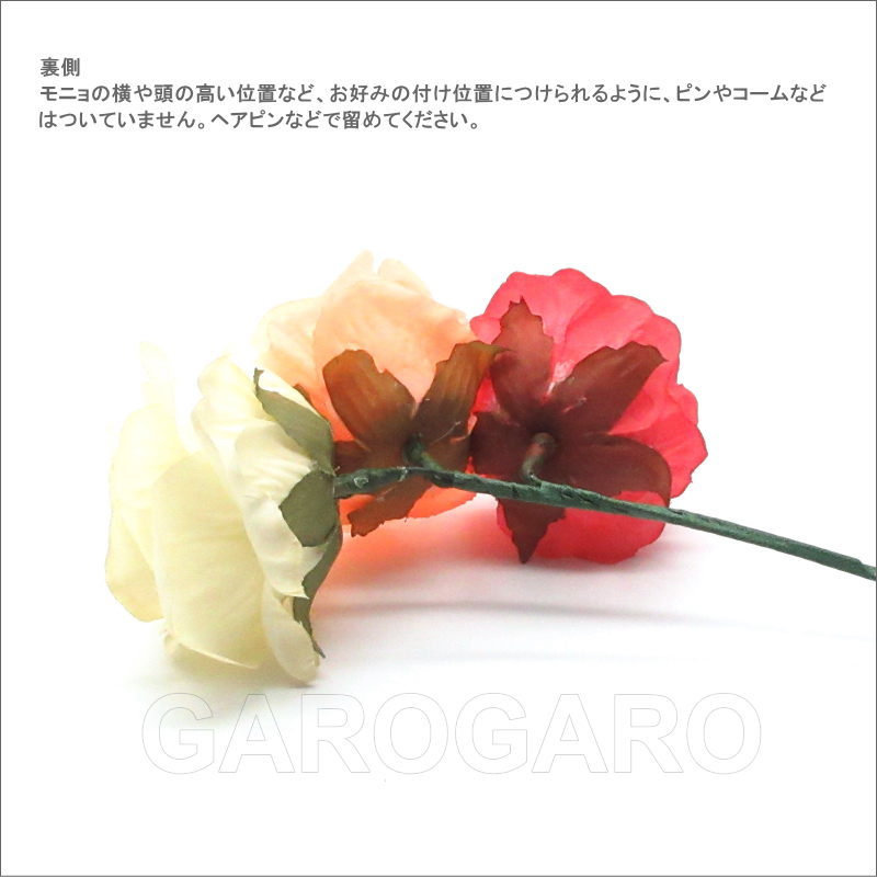補足説明 ・モニョ(おだんごに結った髪型)の横や頭の高い位置など、お好みの付け位置につけられるように、ピンやコームなどはついていません。ヘアピンなどで留めてください。 ・ご覧になるモニターによって、実物と写真の色合いが異なって見える場合があります。 ・衛生上の理由から、商品が入った透明な袋を開封後は返品、交換ができません。 ・布製の造花なので、端にほつれや染ムラがあることがあります。 ・入荷時期によって、花の大きさや色合い、花束風の商品は花の配置、小花や葉の個数がわずかに異なることがあります。 大きく目立つ場合は検品時に取り除きますが、舞台でご使用するのに問題ないと判断できる程度である場合は良品と判断致します。あらかじめご了承下さい。 ・稀に水濡れなどで色落ちする場合があります。ご注意ください。 |