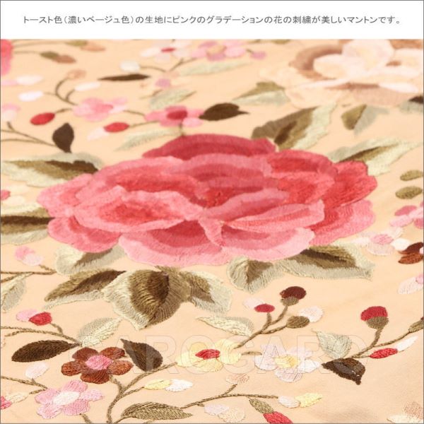 おすすめポイント: シルクの生地に手刺繍を施した 豪華なマントンです【在庫限り】 伝統的な花の刺繍が華やかです。トースト色(ベージュよりも濃い色合い)の生地に、ピンク系のバラを刺繍している上品な配色。刺繍も多くとても豪華な印象です。 フレコの糸生地の色と同じ色。本数は標準的で、編み込み模様も凝っています。 --- 素材: 絹 サイズ(cm): ・生地部分 約135cm ・フレコ約65cm(編みこみ部分を含む) ・重量 約910g 生地部分のサイズは生地の中央で計測しています。 (掲載のサイズは製品の実測値です。多少の個体差がありますがご容赦ください。) |