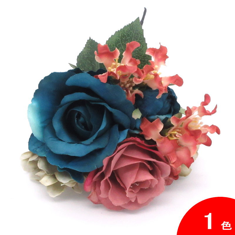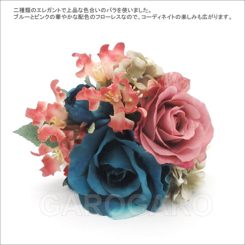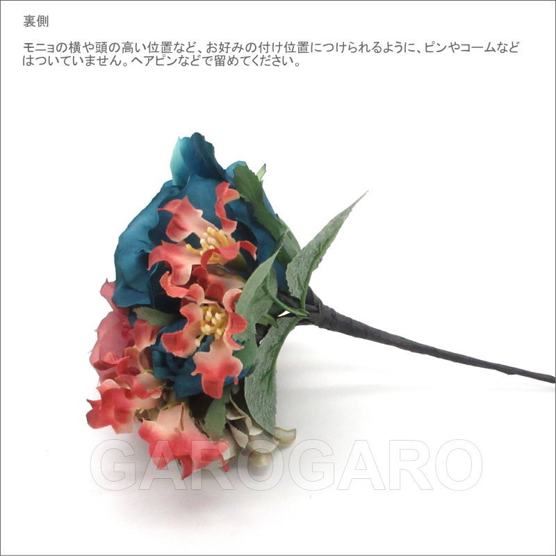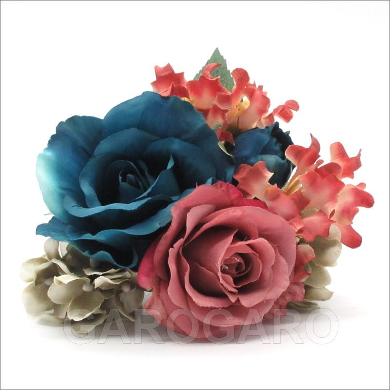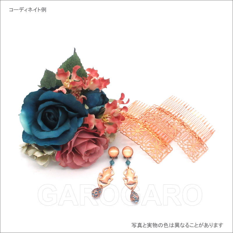 おすすめポイント: 少し緑がかったブルーのバラと、人気のくすみピンクの色の組み合わせのフローレスです。 衣装でもよく見かける配色なので、衣装の色に合わせても素敵です。また、このフローレス1つでも、存在感がありますから、無地で単色の衣装のアクセントとして用いても良いですね。暗い曲調にも合う、上品色です。 --- 素材: 化繊、金属など サイズ(cm): 花部分の大きさ 約12.0×13.0 (掲載のサイズは製品の実測値です。多少の個体差がありますがご容赦ください。) 【コーディネイト例】 ・メタルのペイネシージョ (小さな櫛) Aster (アステル) 色:ブロンズ ・ブロンズ色のイヤリング Cornelia (コルネリア)色:ターコイズブルー |
