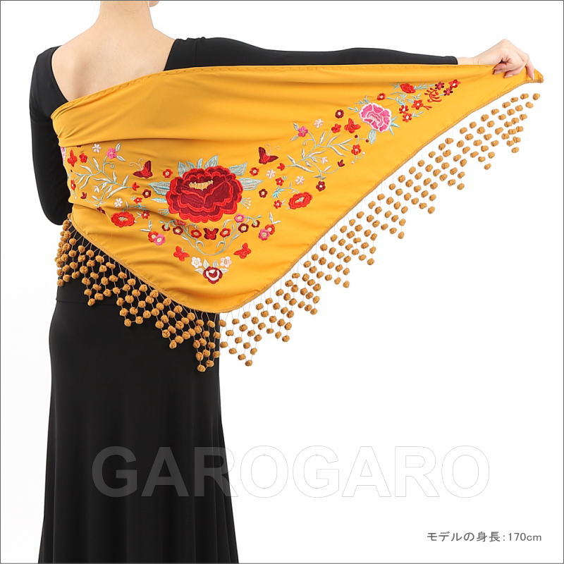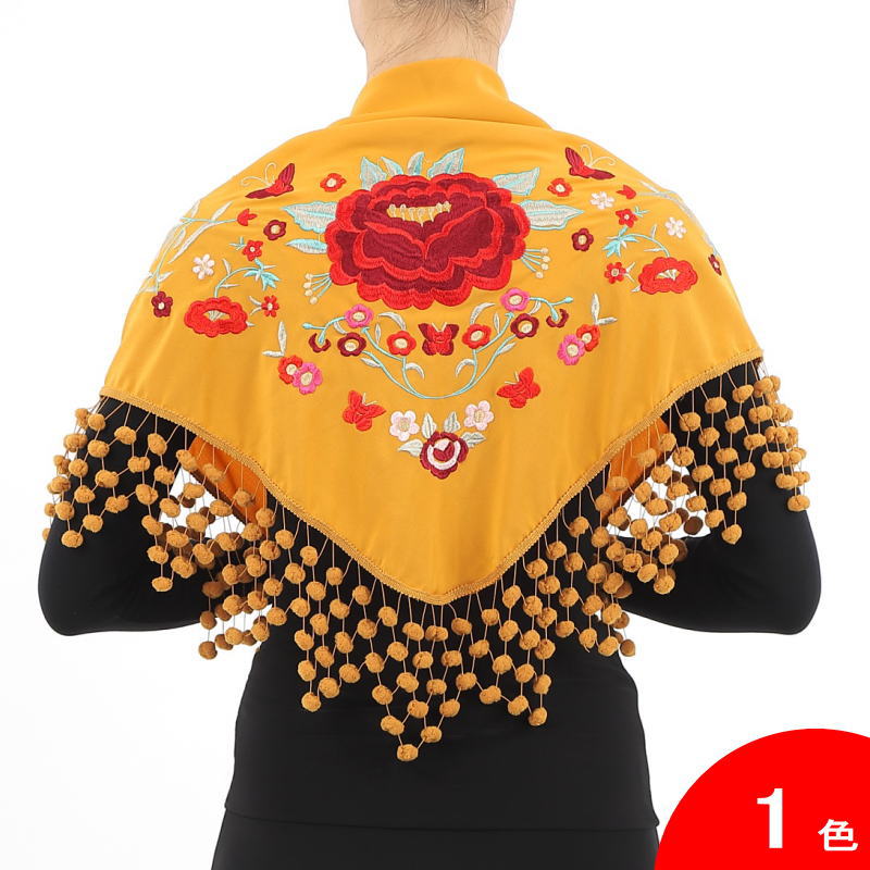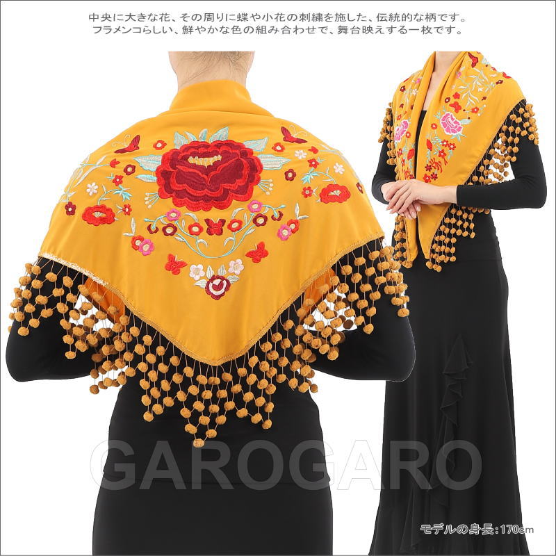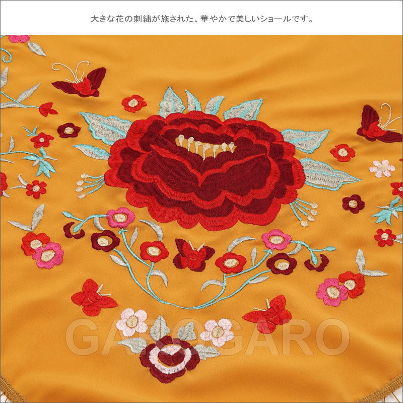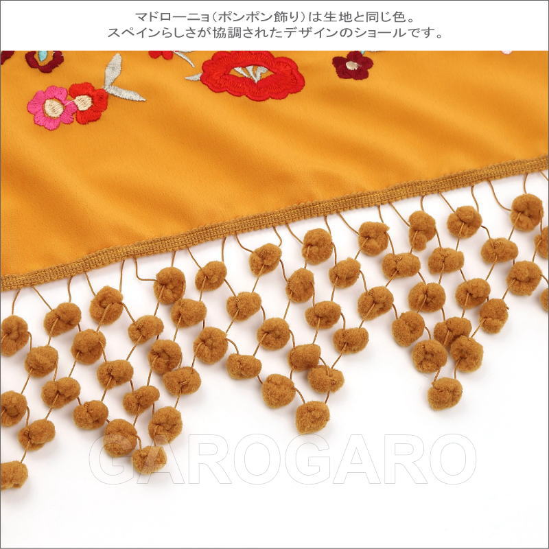 マドローニョのついた刺繍のショール Jardin(ハルディン) マスタード×中央の花:赤紫系[フラメンコ用][スペイン直輸入]