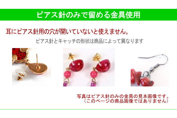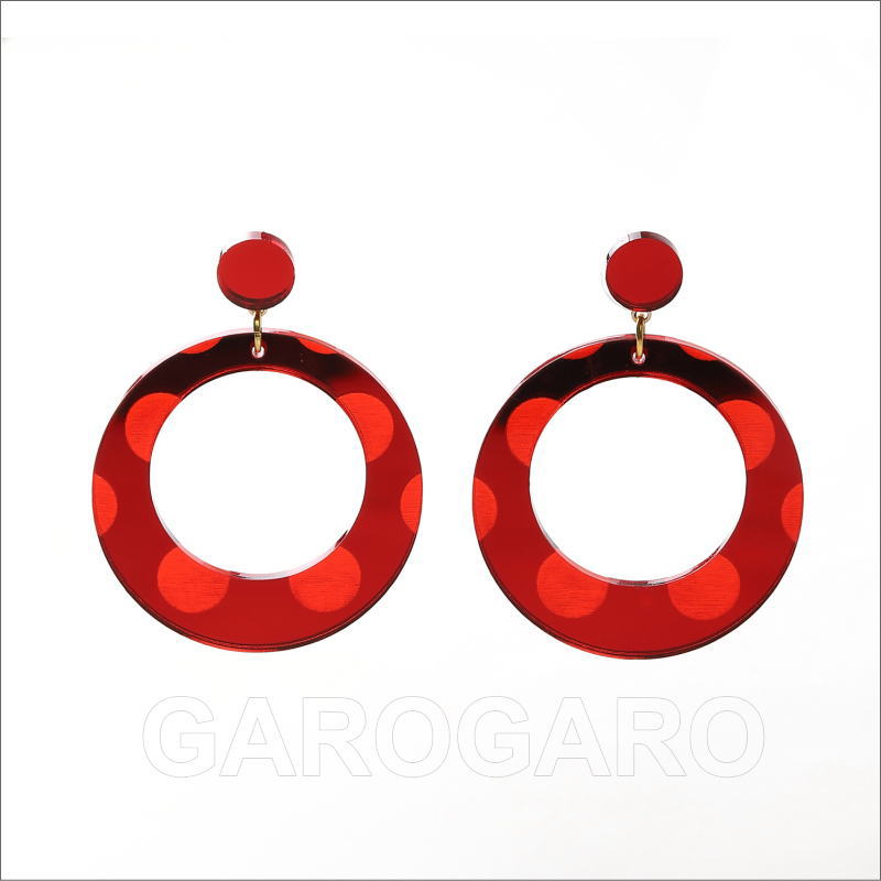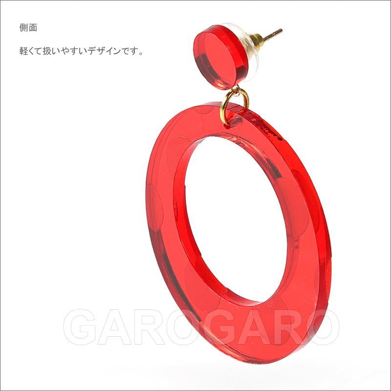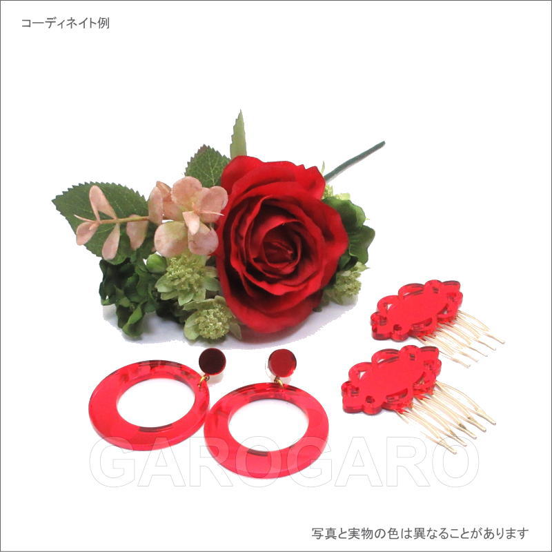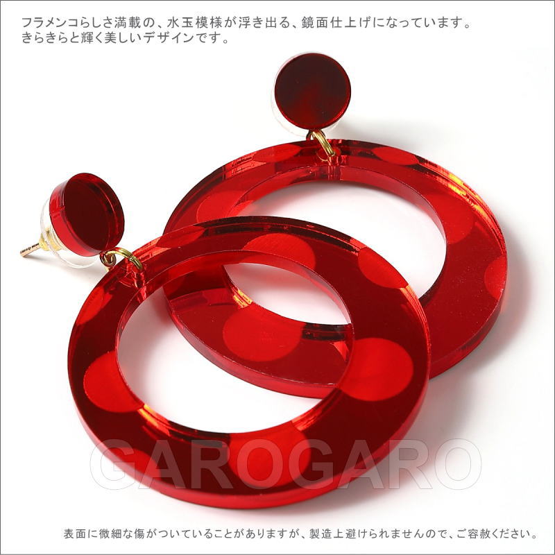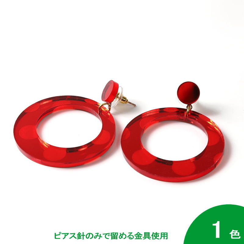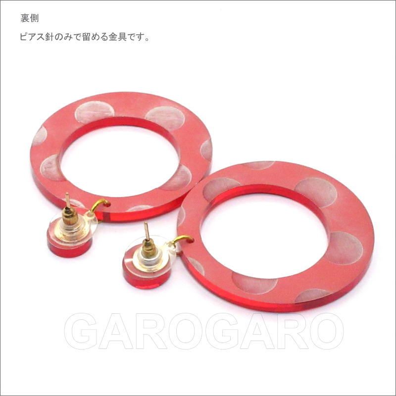 おすすめポイント: 水玉模様が浮き出るデザインのフラメンコらしい輪のピアスです。小ぶりなので夏には普段使いもできそうです。 クリアなアクリル板のような素材の裏に、光を通さない塗料を塗って、鏡のように仕上げています。 光の当たる角度によって、キラッと光ったり、赤い影がこぼれたりする、技ありの新素材を使用しています。 --- 【ピアス】ピアス針のみで留める金具を使用しています。 --- 素材: プラスチック・金属 サイズ(縦の長さ×横幅)cm: 約5.9(飾り部分の長さ:4.4)×4.4 (掲載のサイズは製品の実測値です。多少の個体差がありますがご容赦ください。) 【コーディネイト例】 ・ペイネシージョ(小さな櫛) Espejo(エスペッホ) 色:赤 ・赤いバラの花束風 KA-1 赤×グリーン |