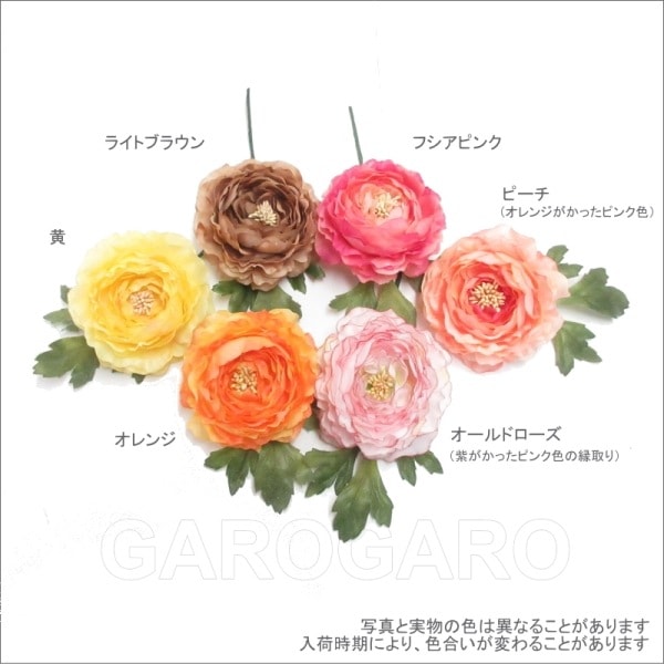 補足説明 ・モニョ(おだんごに結った髪型)の横や頭の高い位置など、お好みの付け位置につけられるように、ピンやコームなどはついていません。ヘアピンなどで留めてください。 ・ご覧になるモニターによって、実物と写真の色合いが異なって見える場合があります。 ・衛生上の理由から、商品が入った透明な袋を開封後は返品、交換ができません。 ・布製の造花なので、端にほつれや染ムラがあることがあります。 ・入荷時期によって、花の大きさや色合い、花束風の商品は花の配置、小花や葉の個数がわずかに異なることがあります。 大きく目立つ場合は検品時に取り除きますが、舞台でご使用するのに問題ないと判断できる程度である場合は良品と判断致します。あらかじめご了承下さい。 ・稀に水濡れなどで色落ちする場合があります。ご注意ください。 |