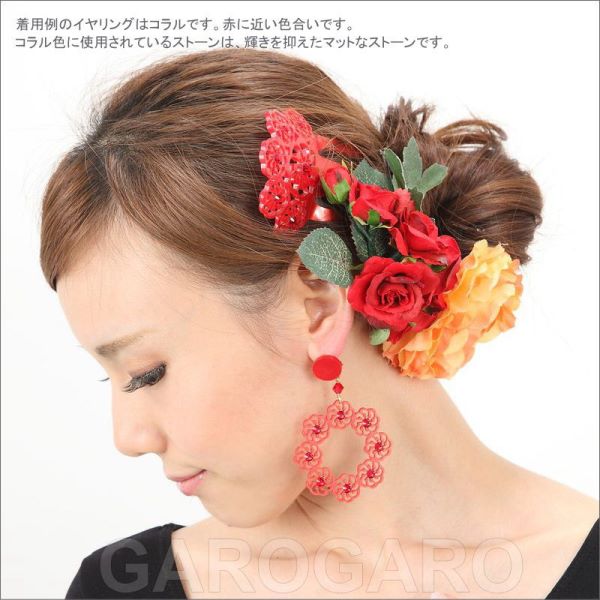 おすすめポイント: フラメンコの定番の形「輪」のイヤリングを花のモチーフで作るとこんなに斬新でエレガントに。 衣装にあわせて選べるカラフルな色が舞台で映えます。 --- 【ピアス針つき】ピアス針とクリップが両方ついたスペインの留め具を使用しています。 --- 素材: プラスチック・金属 サイズ(縦の長さ×横幅)cm: 約8.0(飾り部分の長さ:6.6)×5.2 (掲載のサイズは製品の実測値です。多少の個体差がありますがご容赦ください。) 【コーディネイト例】 ・ラインストーンのペイネタ(櫛) Olivia(オリビア) 色:ピンク ・花束風 Mariam(マリアン) フシアピンク×黄緑系 |