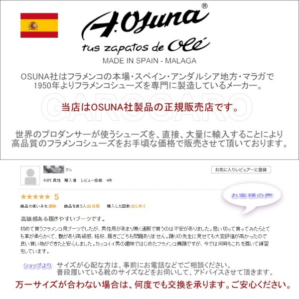 おすすめポイント: 【釘なし】初めてのブーツにおすすめに最適な釘のついた入門用シューズです。 中級者も満足のできる品質です。 主に男性用ですが、女性でも履くことがあります。 釘なしシューズは床に傷をつけたくないスポーツクラブや共用のスタジオなどにおすすめです。 OSUNA(オスーナ) は、日本人にうれしい、幅の広い木型で作られています。 足に馴染みやすい柔らかい革質です。 サイズ交換は何度でも承ります。遠慮なくご相談ください。 同じ商品とのサイズ交換はできない場合は、在庫のある他のモデルへの交換などで対応可能です。 --- 素材: 牛革 Piel (表皮) サイズ(cm): 選択オプションに記載の対応日本サイズをご確認ください。 (掲載のサイズは製品の実測値です。多少の個体差がありますがご容赦ください。) |